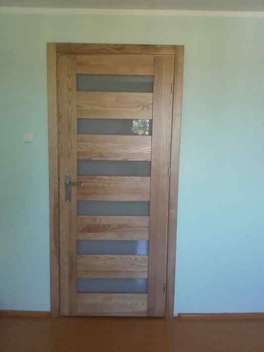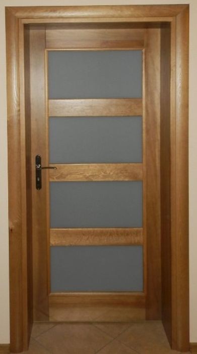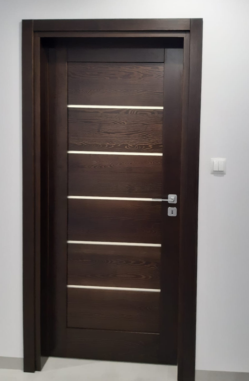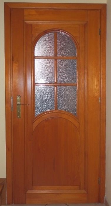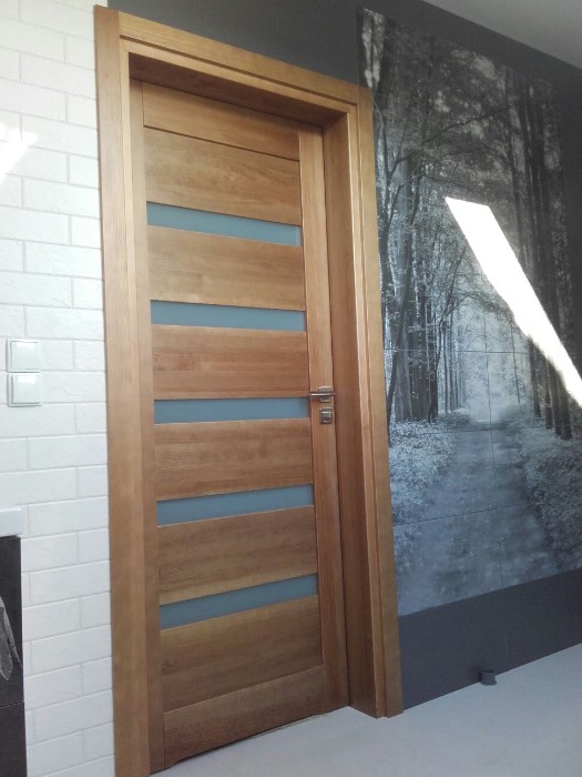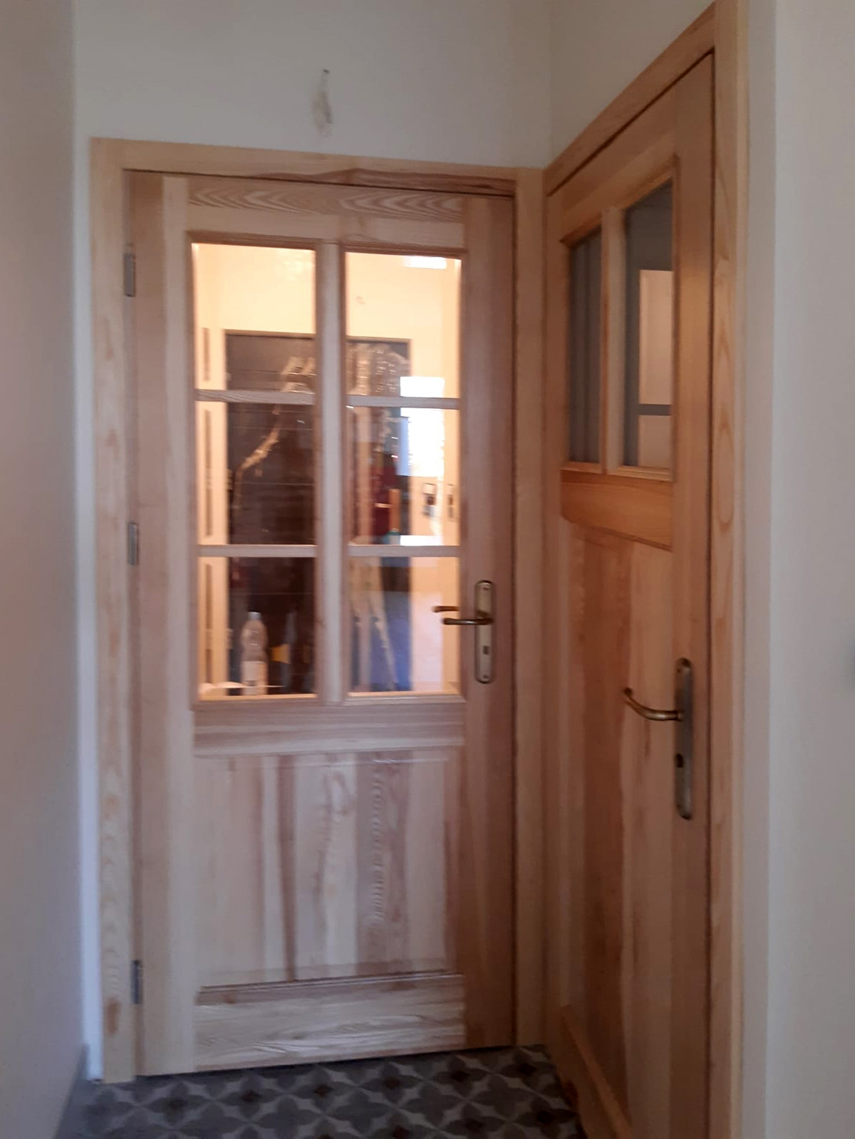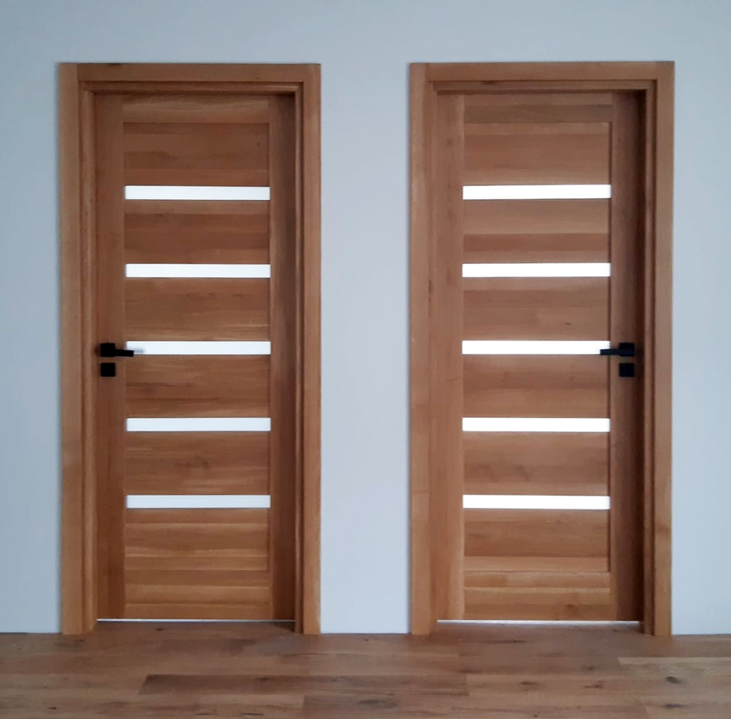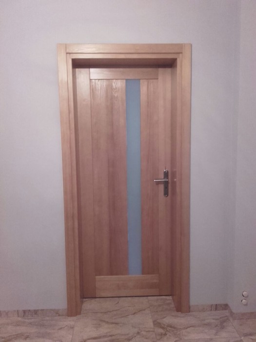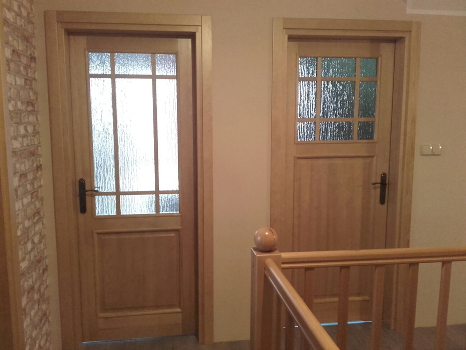 Drzwi drewniane wewnętrzne wykonujemy z drewna klejonego: sosnowego, jesionowego lub dębowego. Wzór dowolny, według wizji klienta. Do produkcji drzwi z szybą używamy szkła mlecznego, hartowanego, fazowanego, piaskowanego.