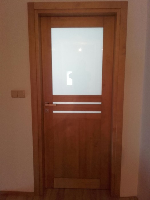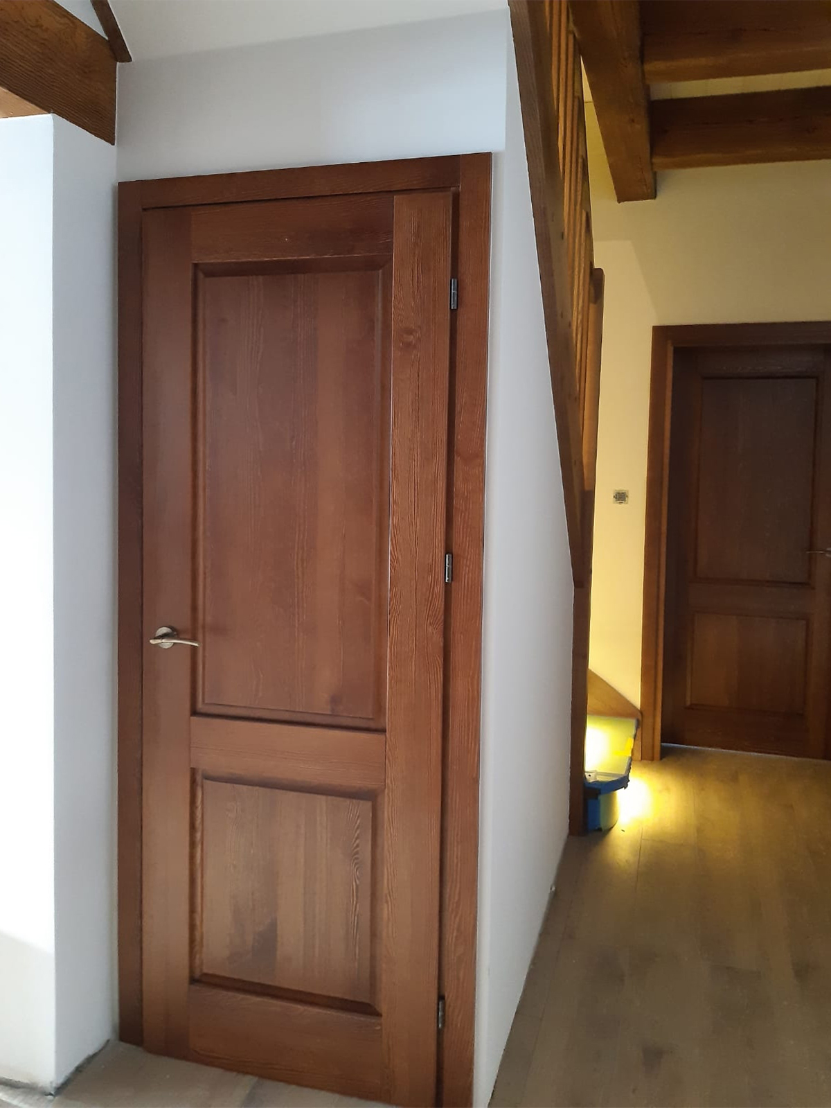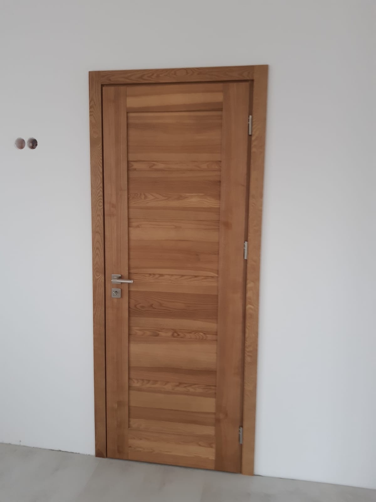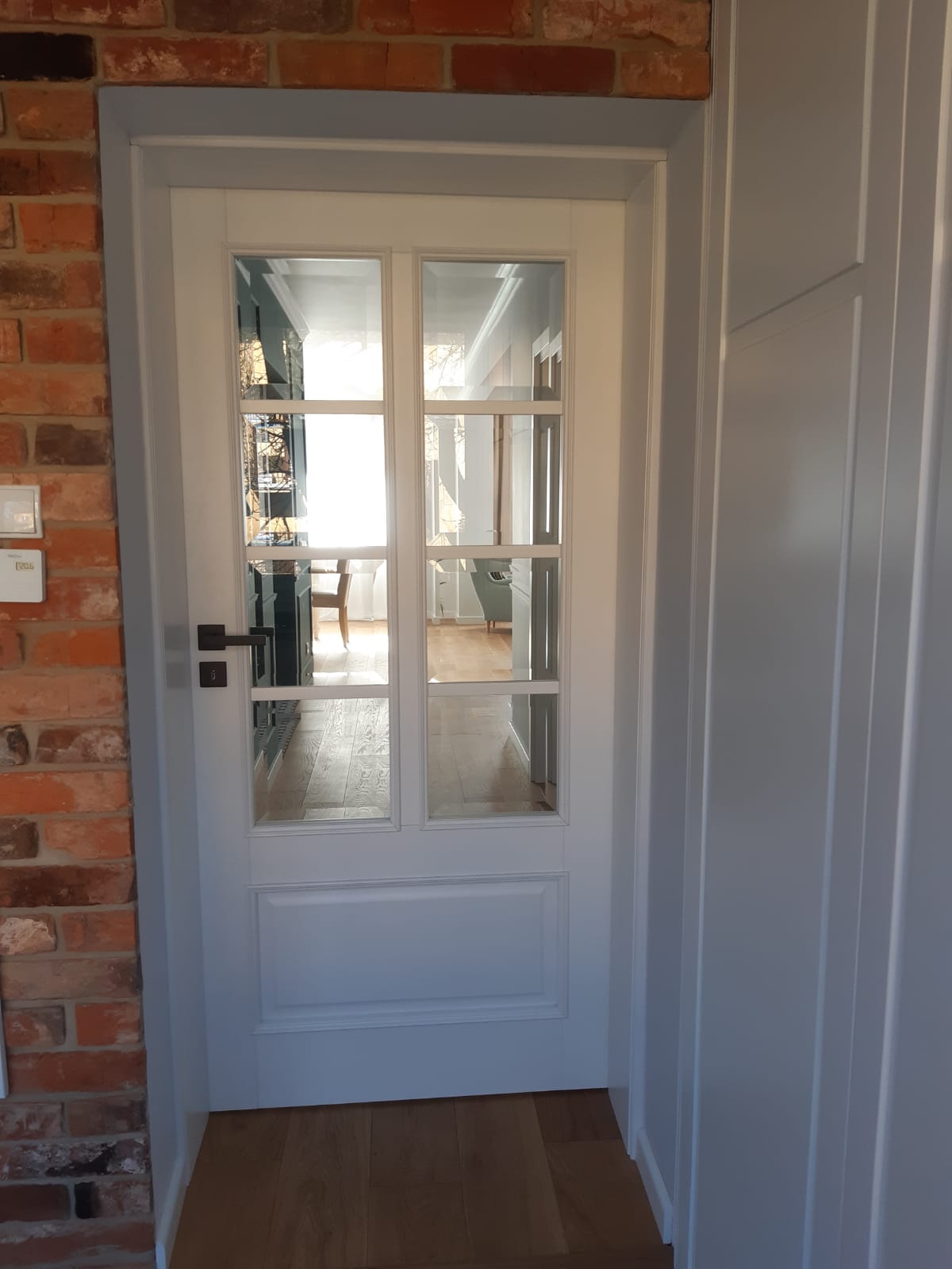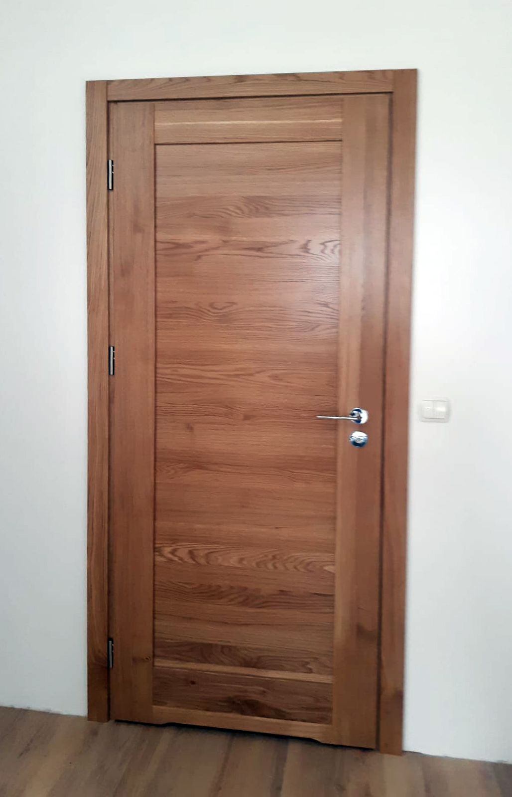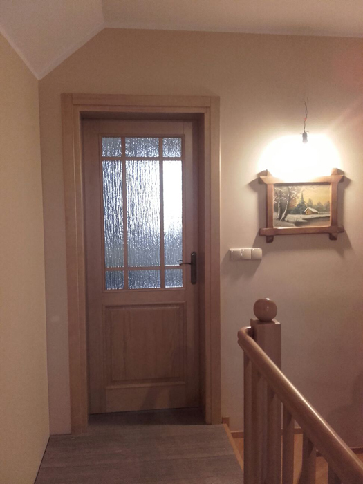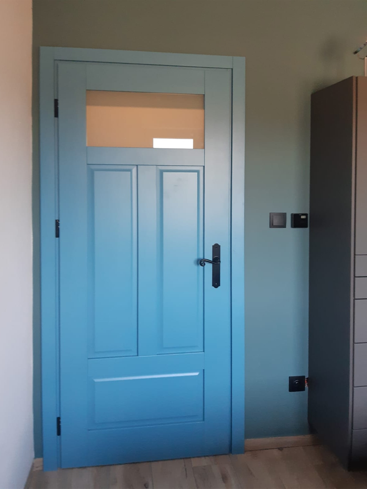 Drzwi drewniane wewnętrzne wykonujemy z drewna klejonego: sosnowego, jesionowego lub dębowego. Wzór dowolny, według wizji klienta. Do produkcji drzwi z szybą używamy szkła mlecznego, hartowanego, fazowanego, piaskowanego.