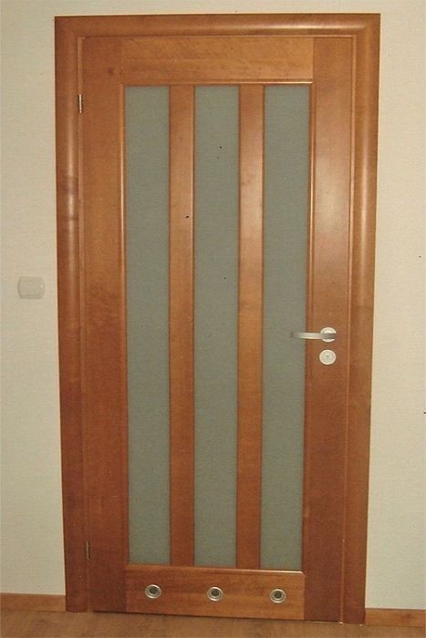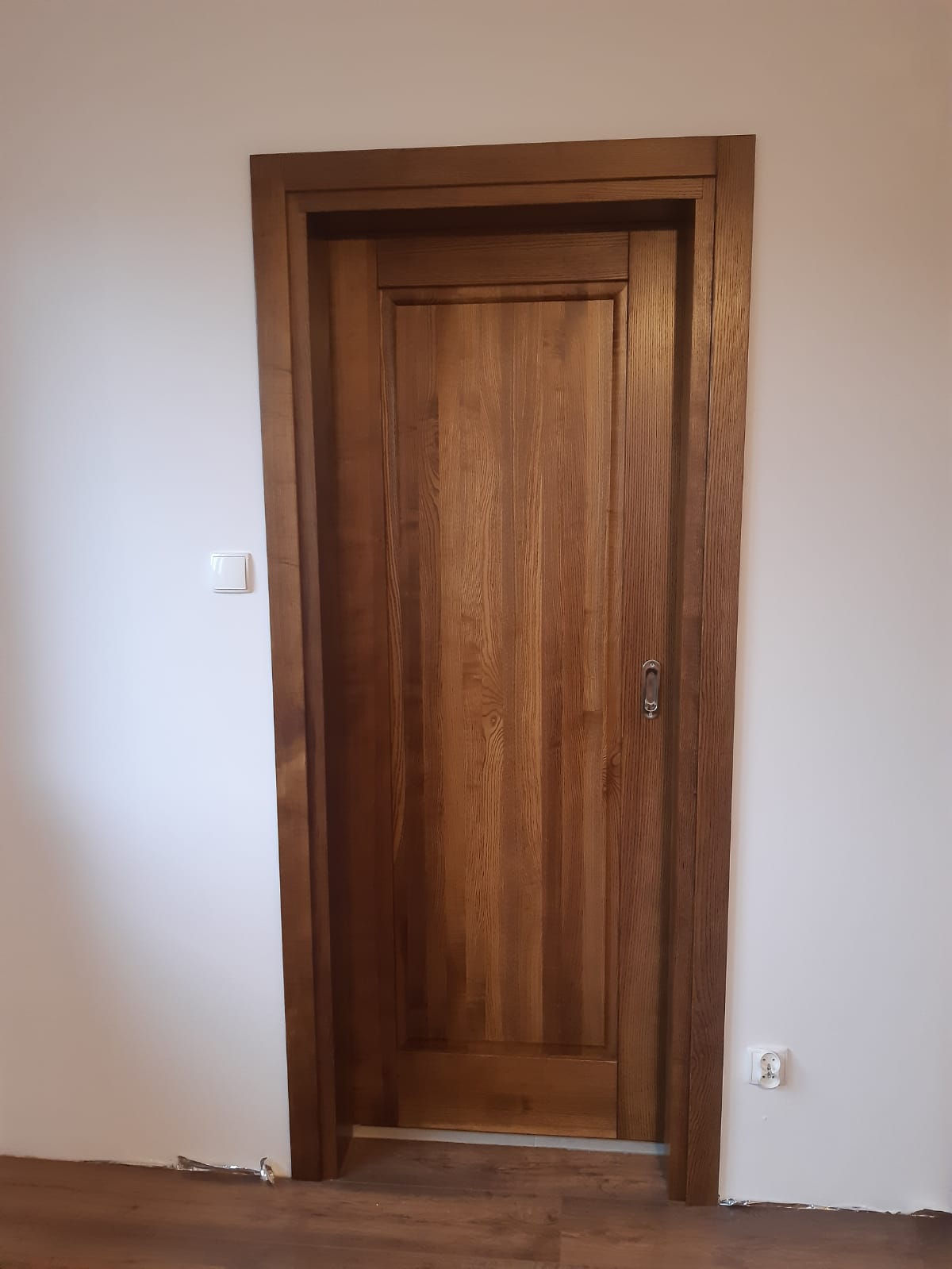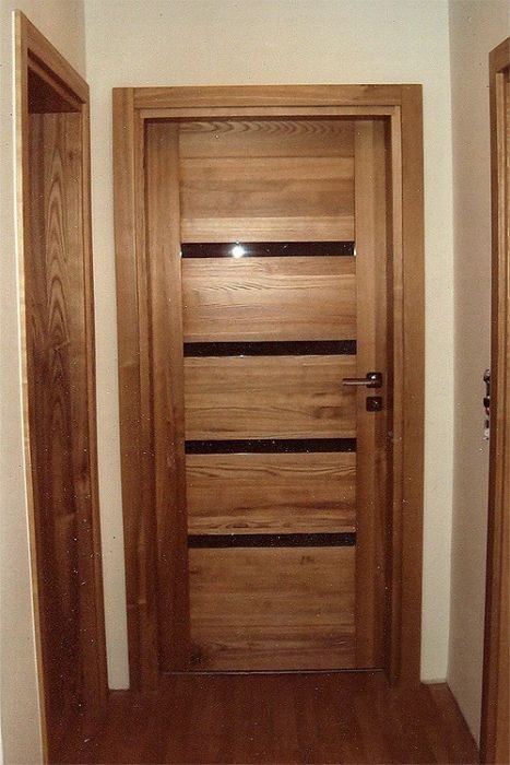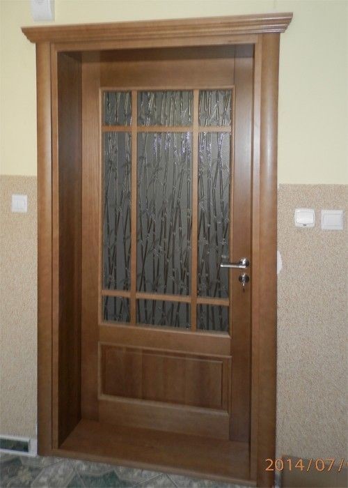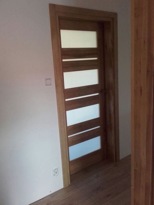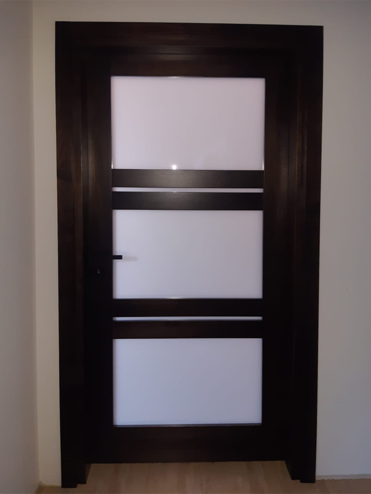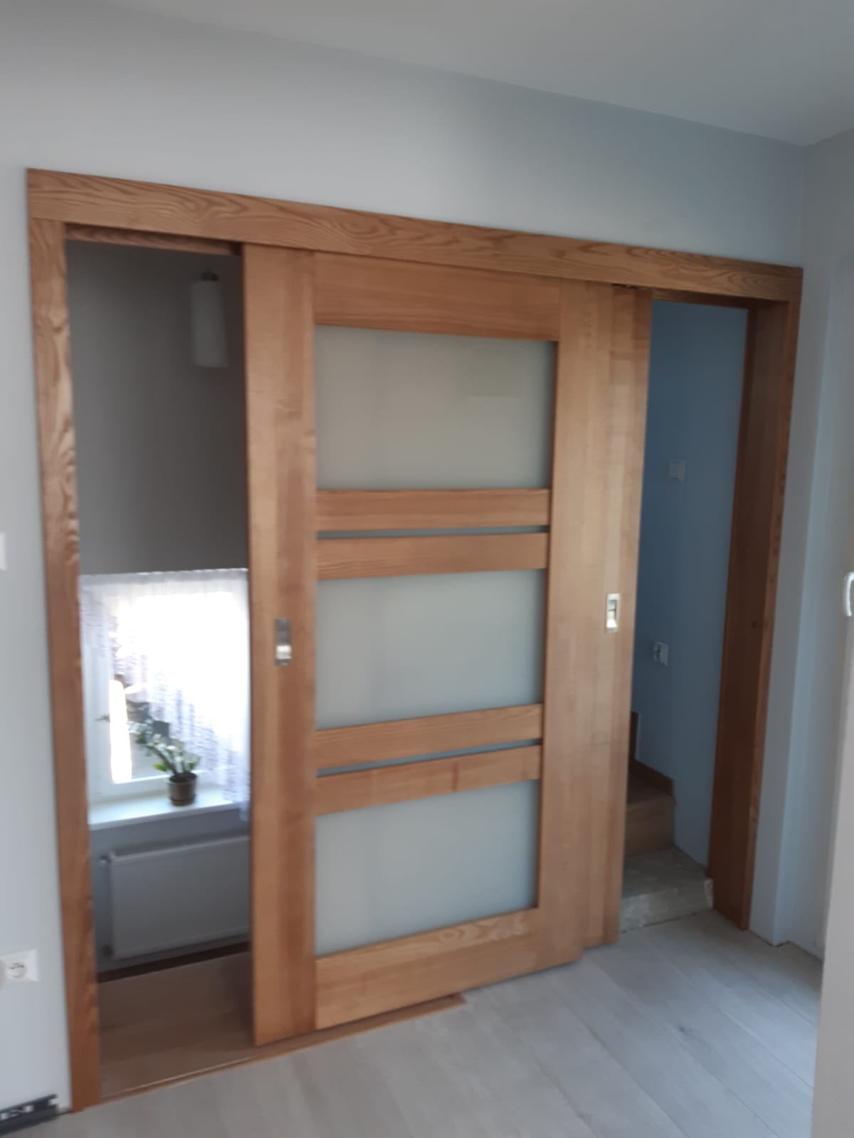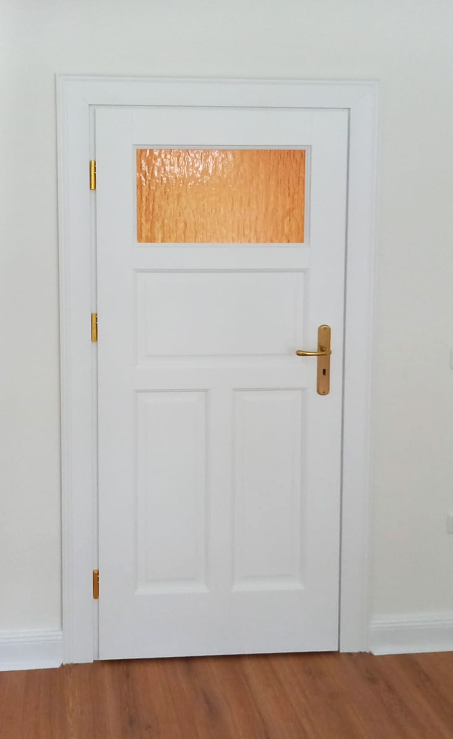 Drzwi drewniane wewnętrzne wykonujemy z drewna klejonego: sosnowego, jesionowego lub dębowego. Wzór dowolny, według wizji klienta. Do produkcji drzwi z szybą używamy szkła mlecznego, hartowanego, fazowanego, piaskowanego.