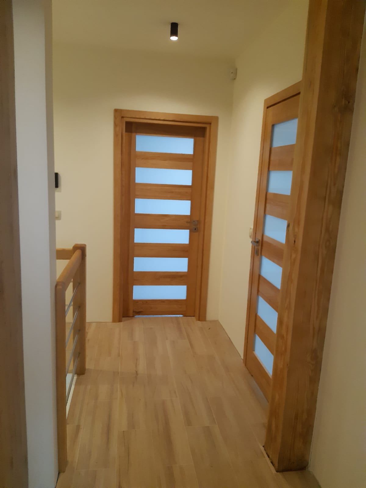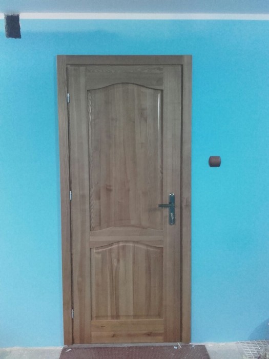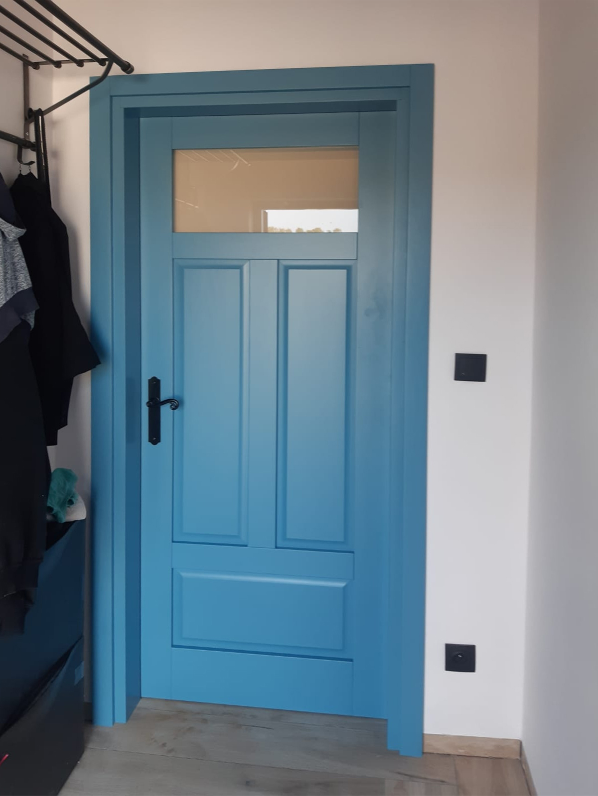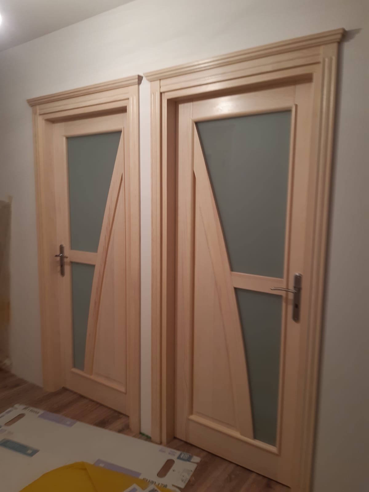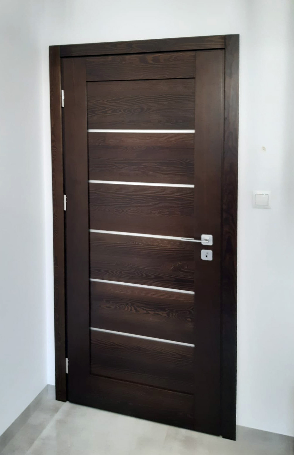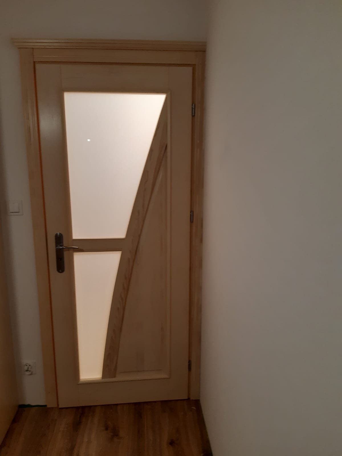 Drzwi drewniane wewnętrzne wykonujemy z drewna klejonego: sosnowego, jesionowego lub dębowego. Wzór dowolny, według wizji klienta. Do produkcji drzwi z szybą używamy szkła mlecznego, hartowanego, fazowanego, piaskowanego.