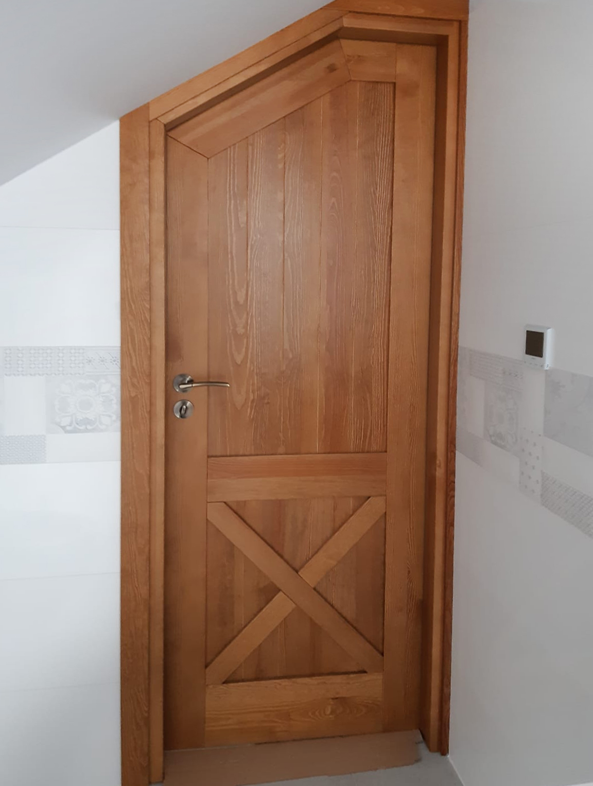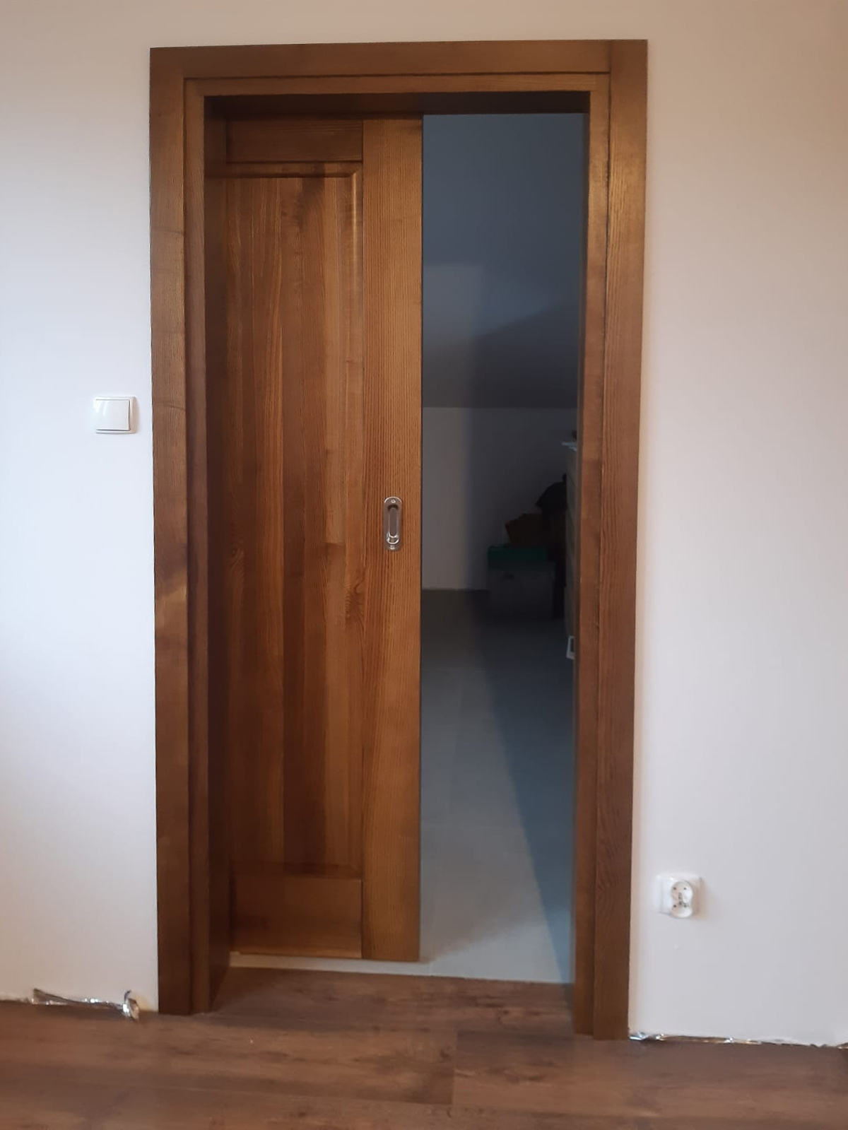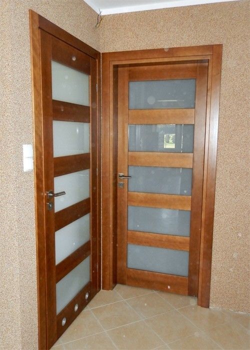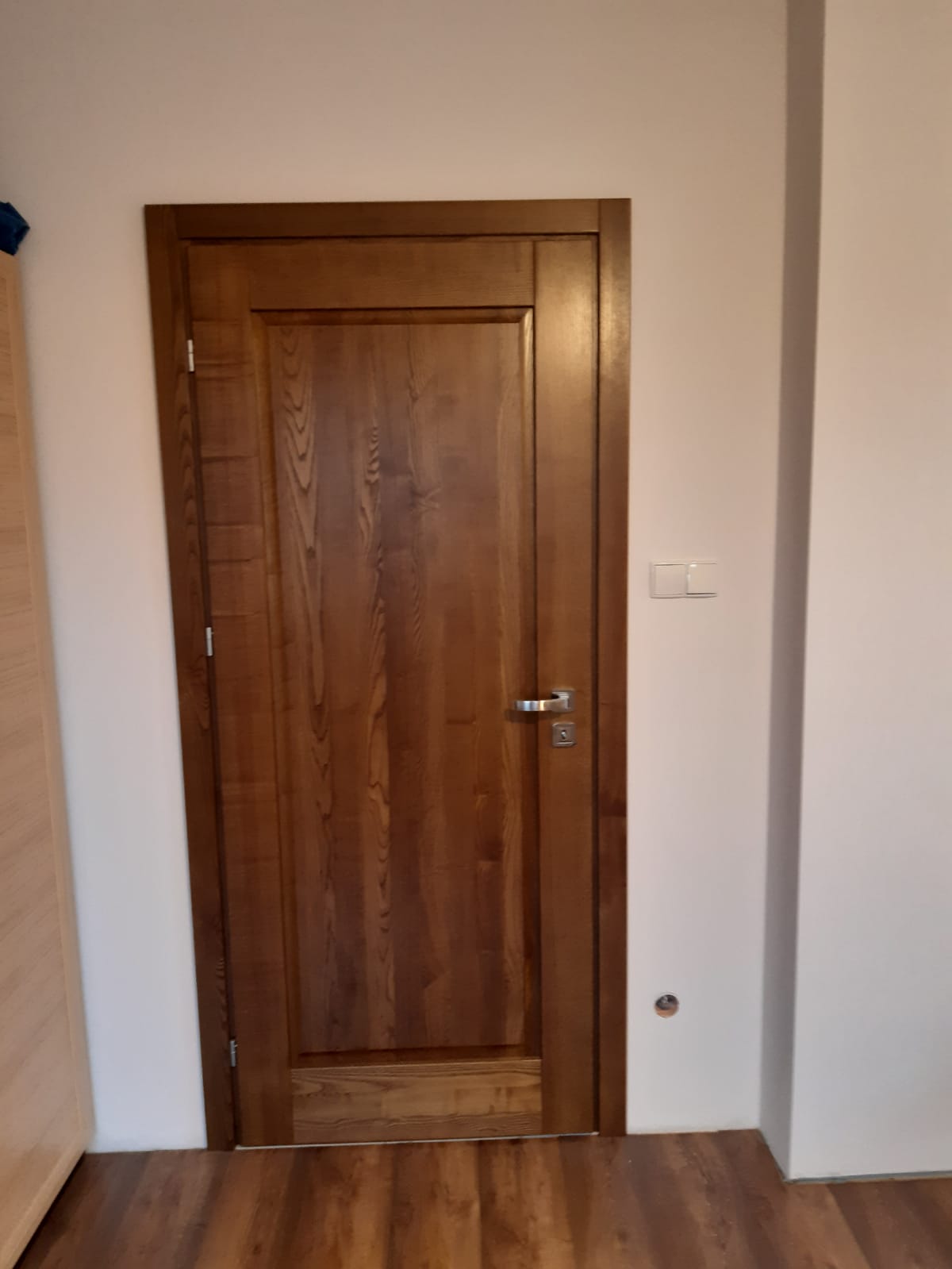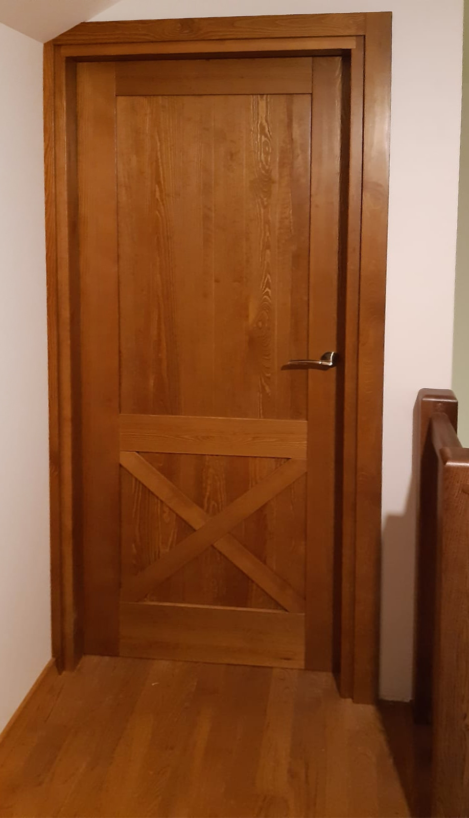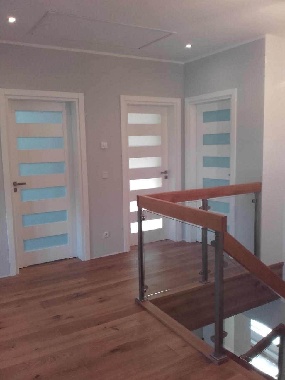 Drzwi drewniane wewnętrzne wykonujemy z drewna klejonego: sosnowego, jesionowego lub dębowego. Wzór dowolny, według wizji klienta. Do produkcji drzwi z szybą używamy szkła mlecznego, hartowanego, fazowanego, piaskowanego.