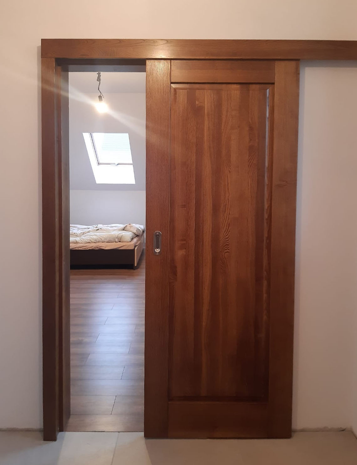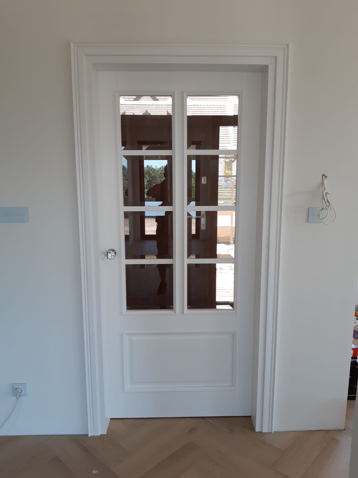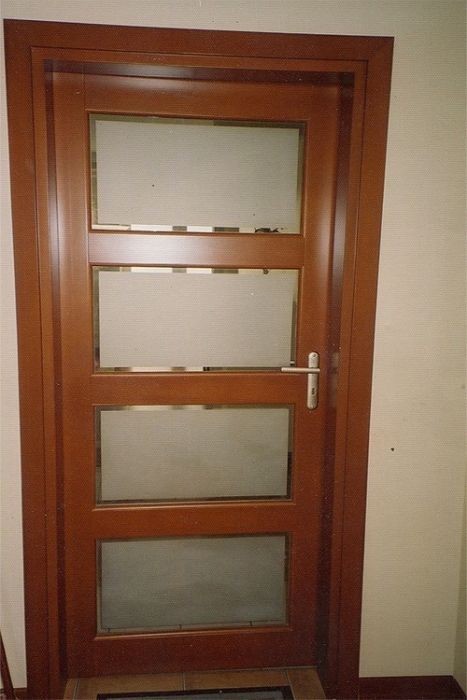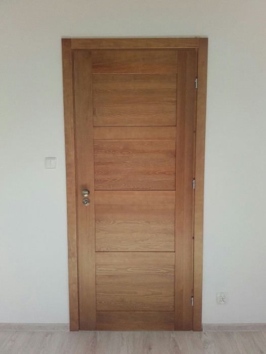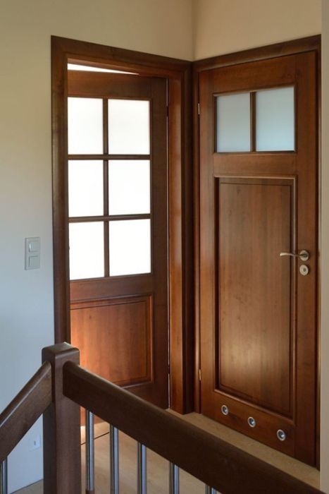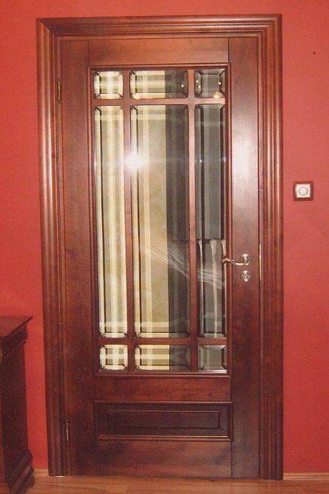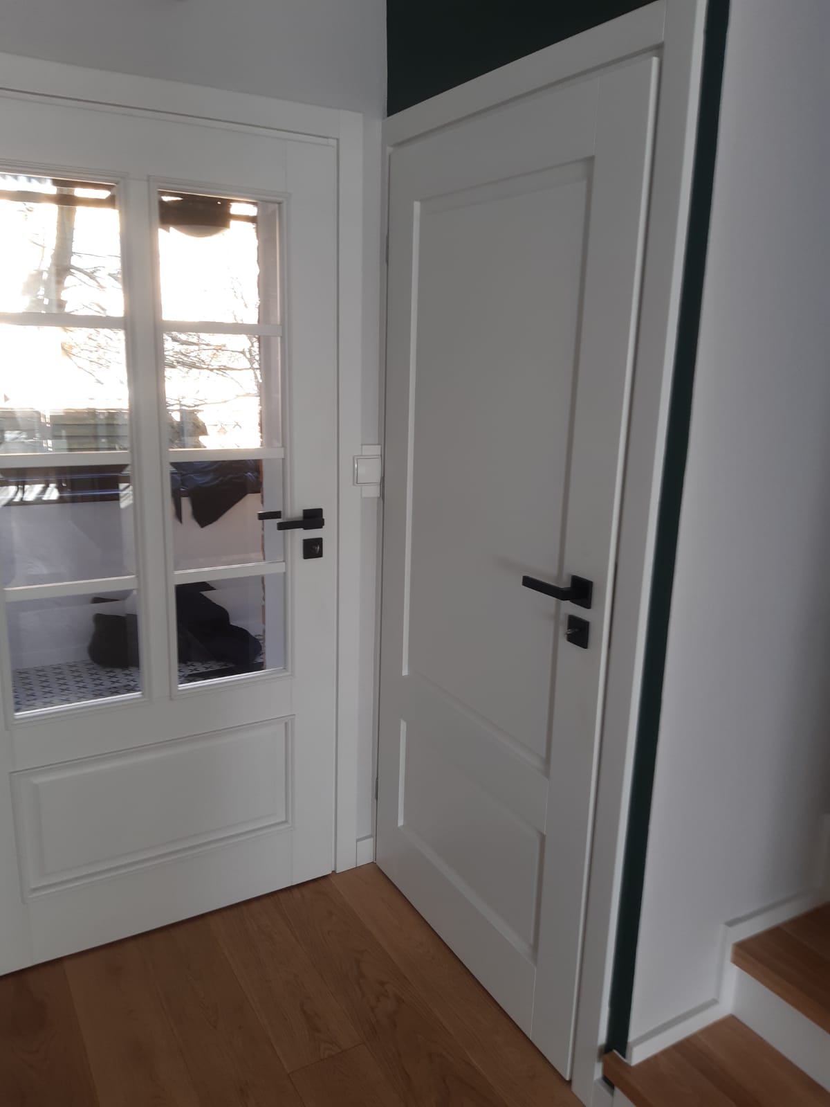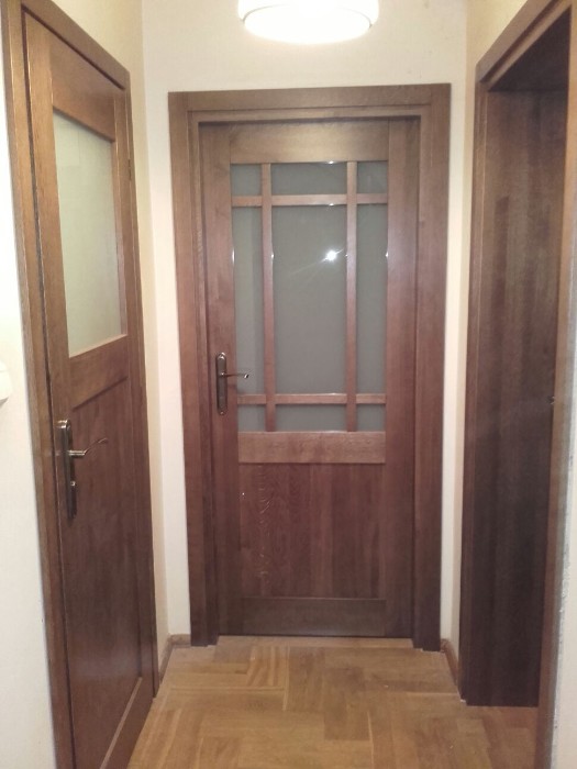 Drzwi drewniane wewnętrzne wykonujemy z drewna klejonego: sosnowego, jesionowego lub dębowego. Wzór dowolny, według wizji klienta. Do produkcji drzwi z szybą używamy szkła mlecznego, hartowanego, fazowanego, piaskowanego.