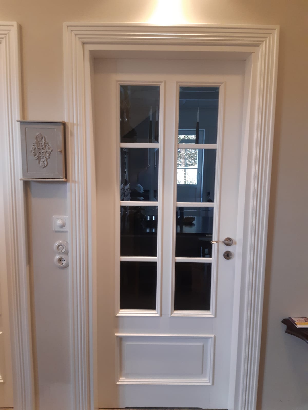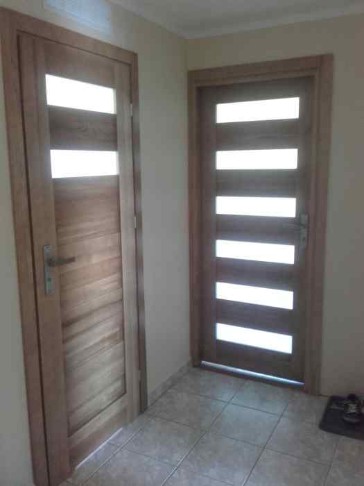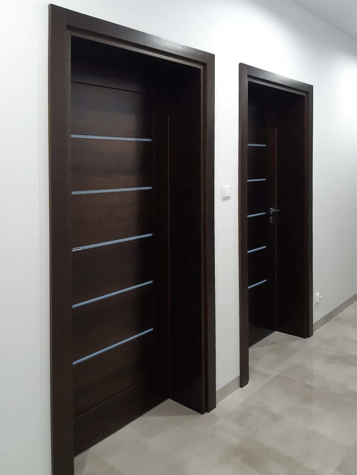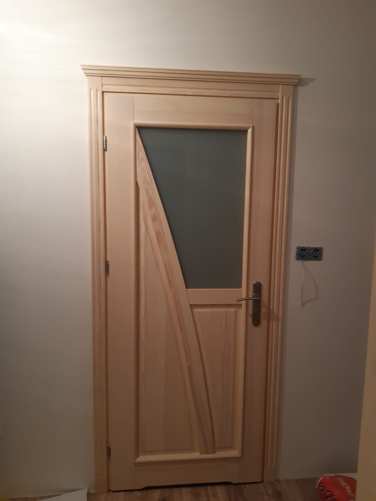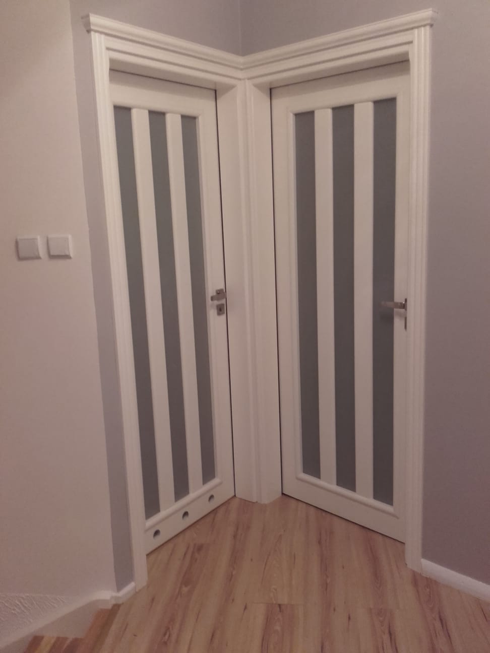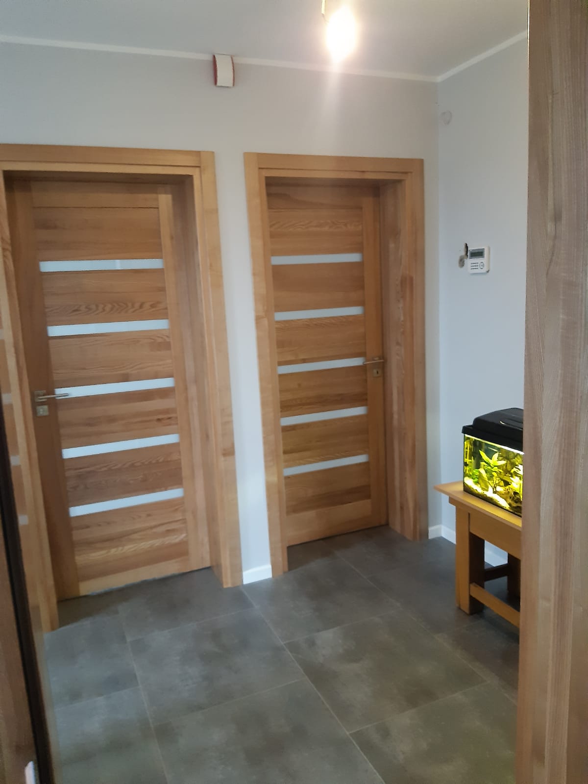 Drzwi drewniane wewnętrzne wykonujemy z drewna klejonego: sosnowego, jesionowego lub dębowego. Wzór dowolny, według wizji klienta. Do produkcji drzwi z szybą używamy szkła mlecznego, hartowanego, fazowanego, piaskowanego.