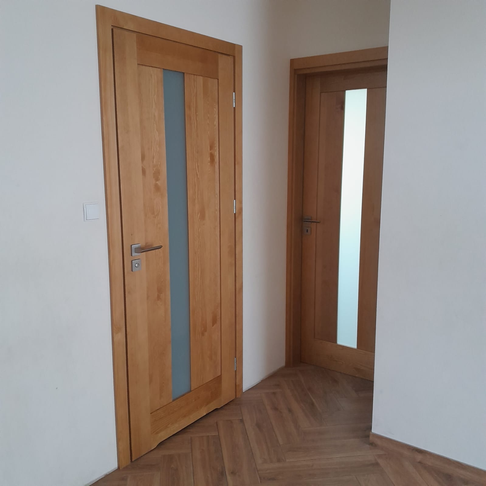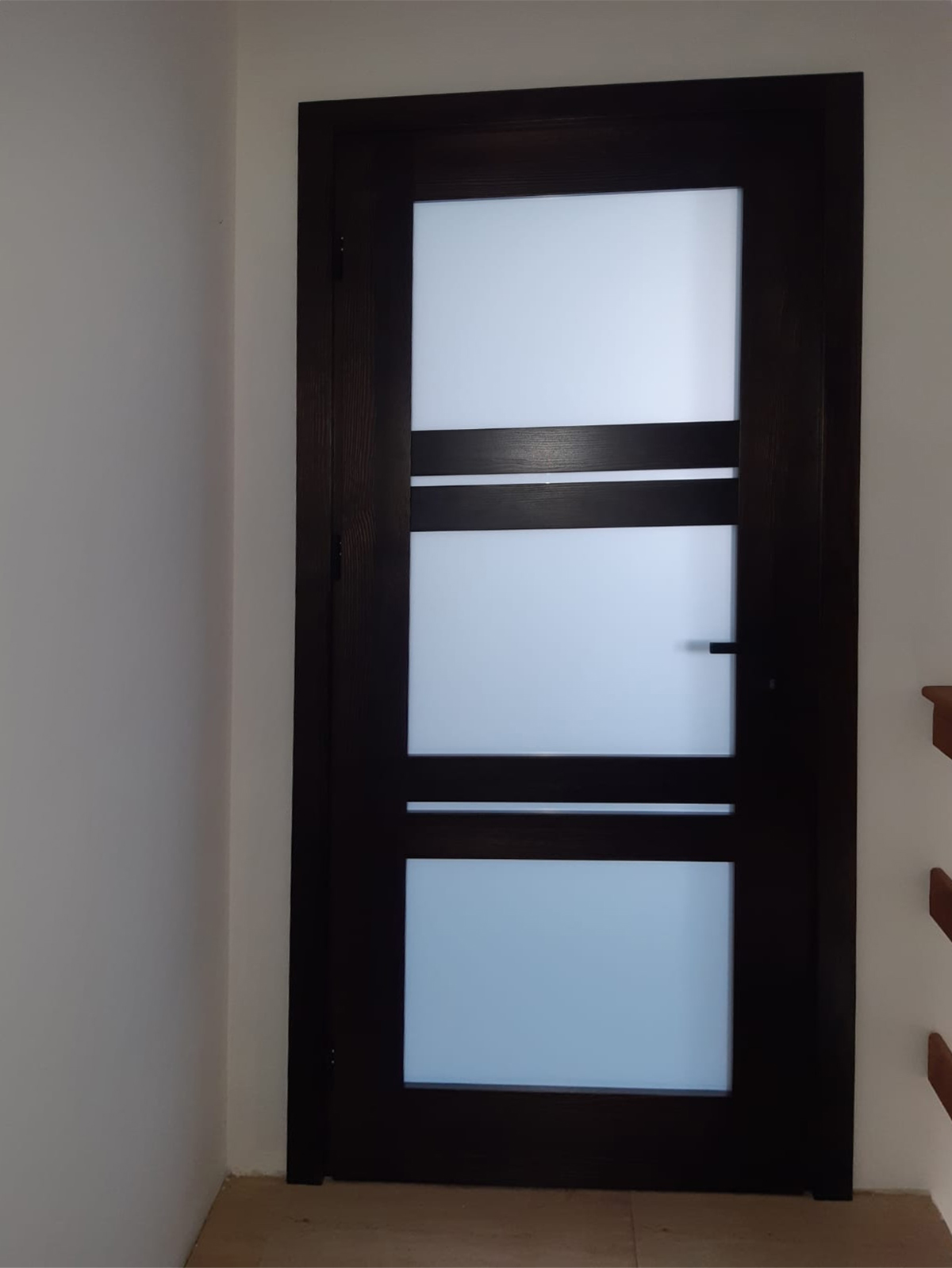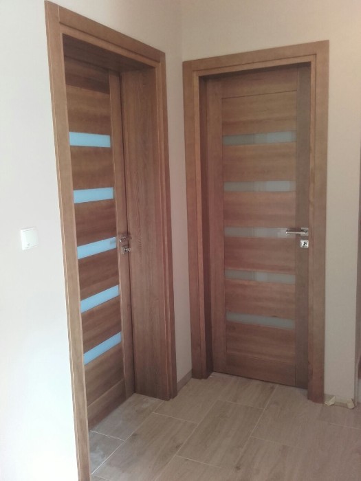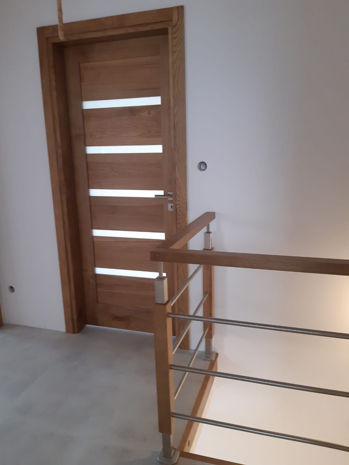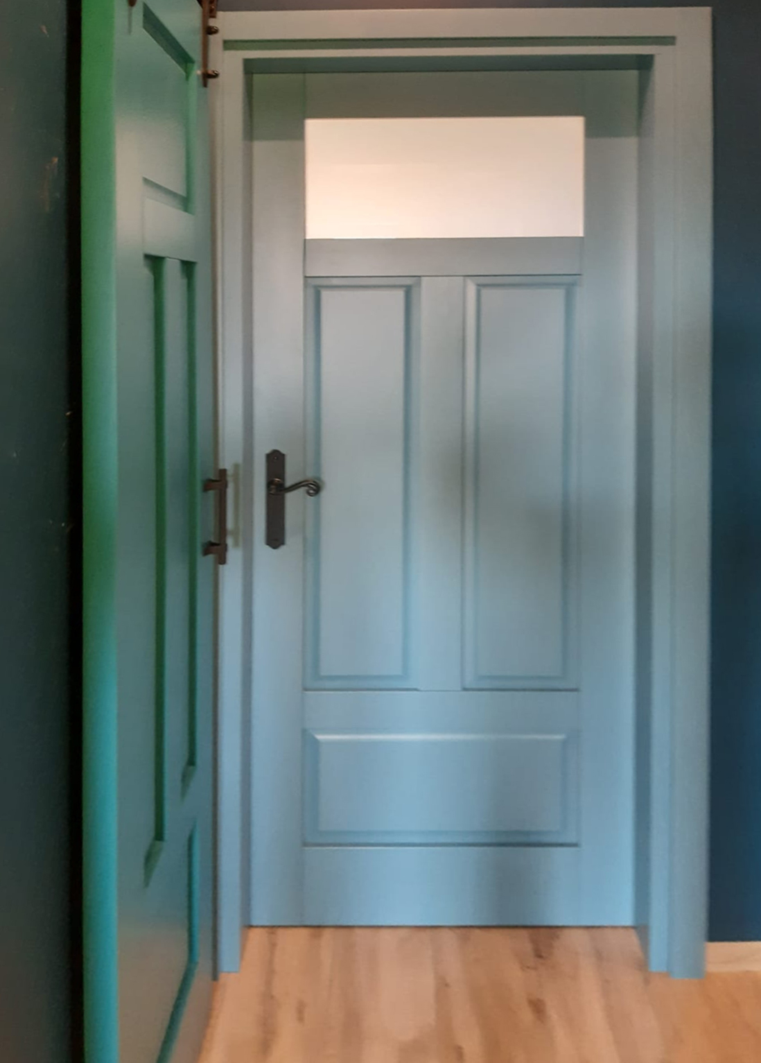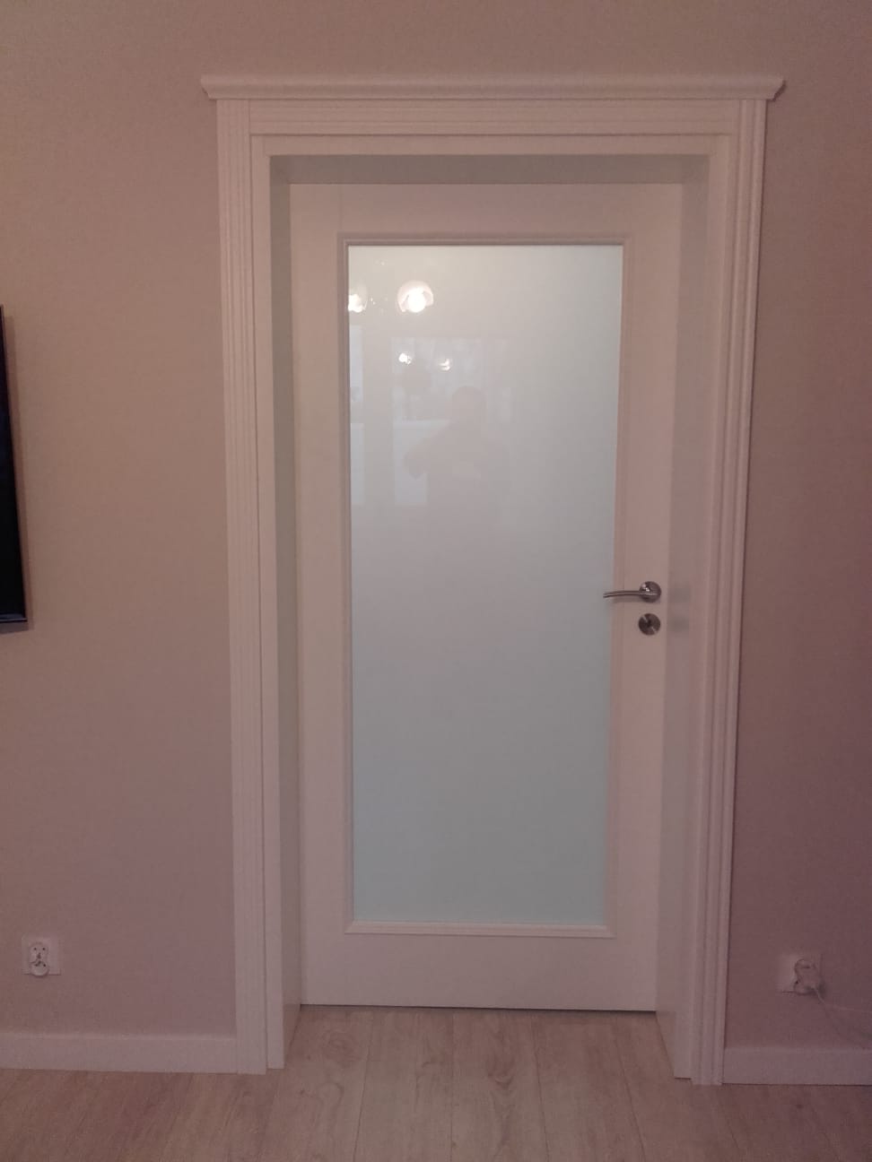 Drzwi drewniane wewnętrzne wykonujemy z drewna klejonego: sosnowego, jesionowego lub dębowego. Wzór dowolny, według wizji klienta. Do produkcji drzwi z szybą używamy szkła mlecznego, hartowanego, fazowanego, piaskowanego.