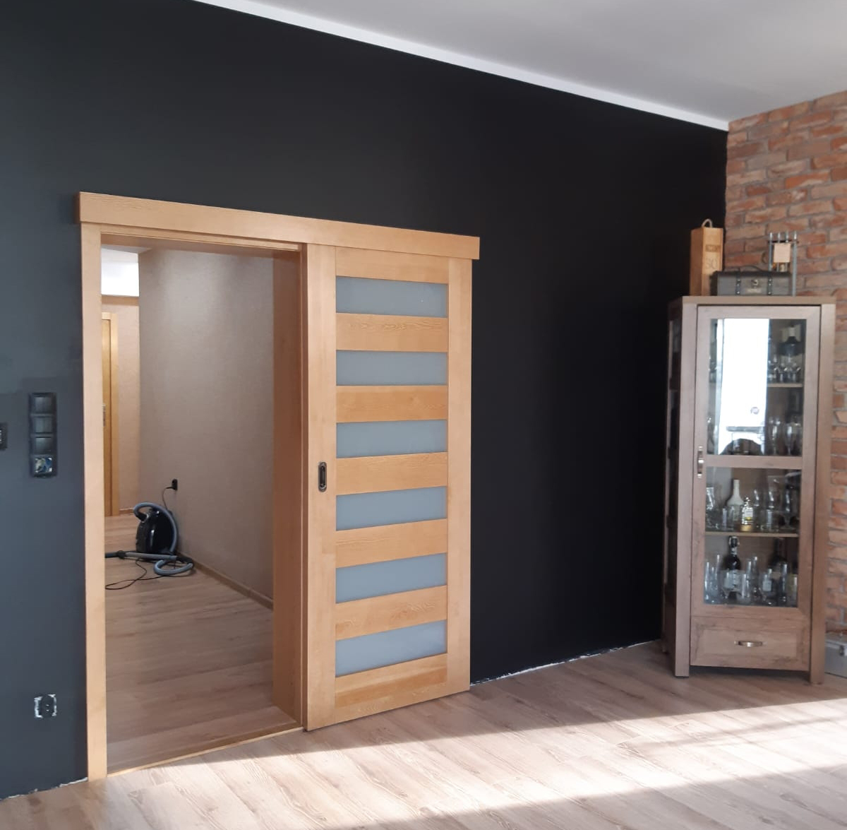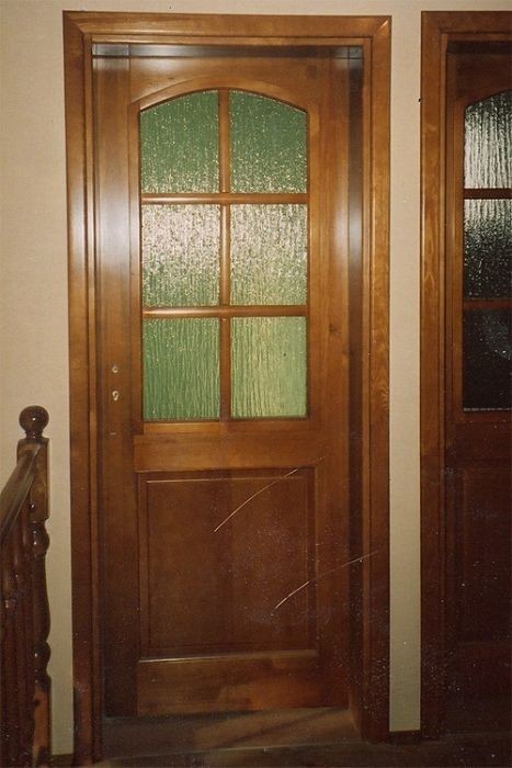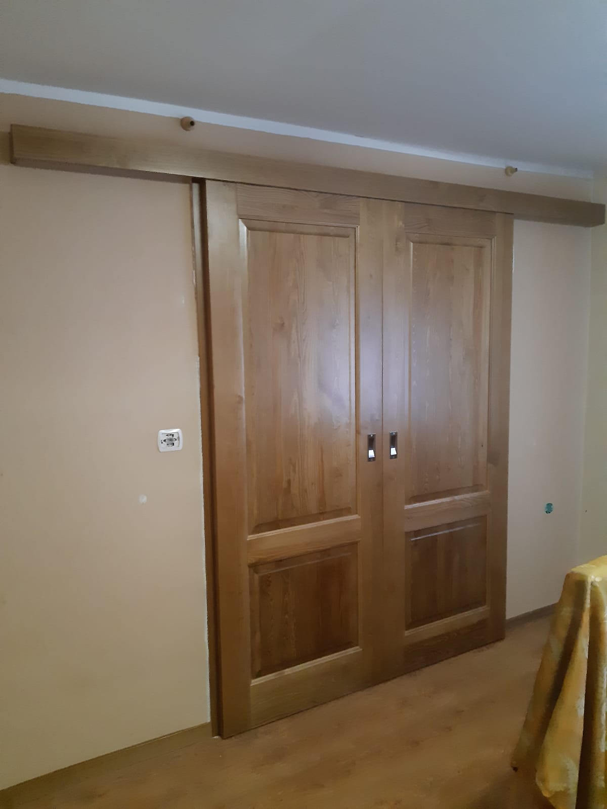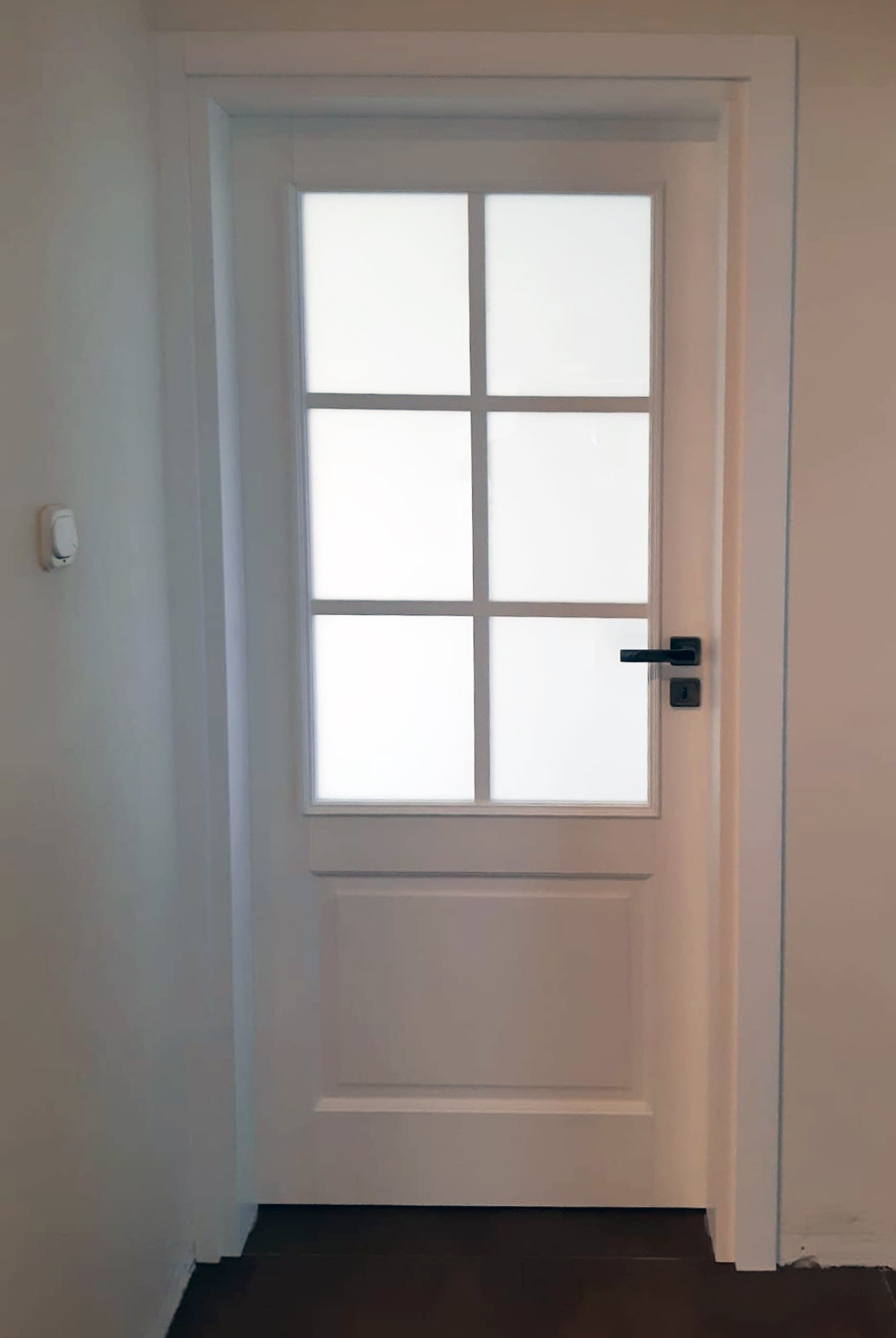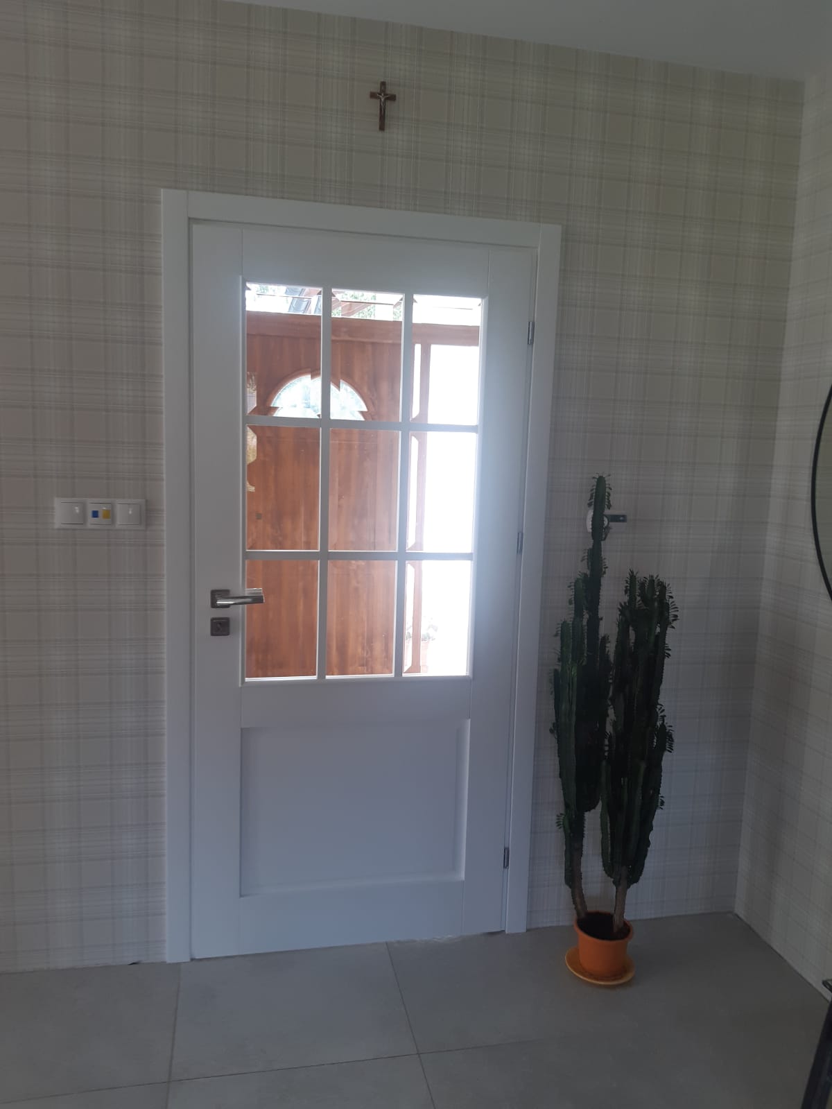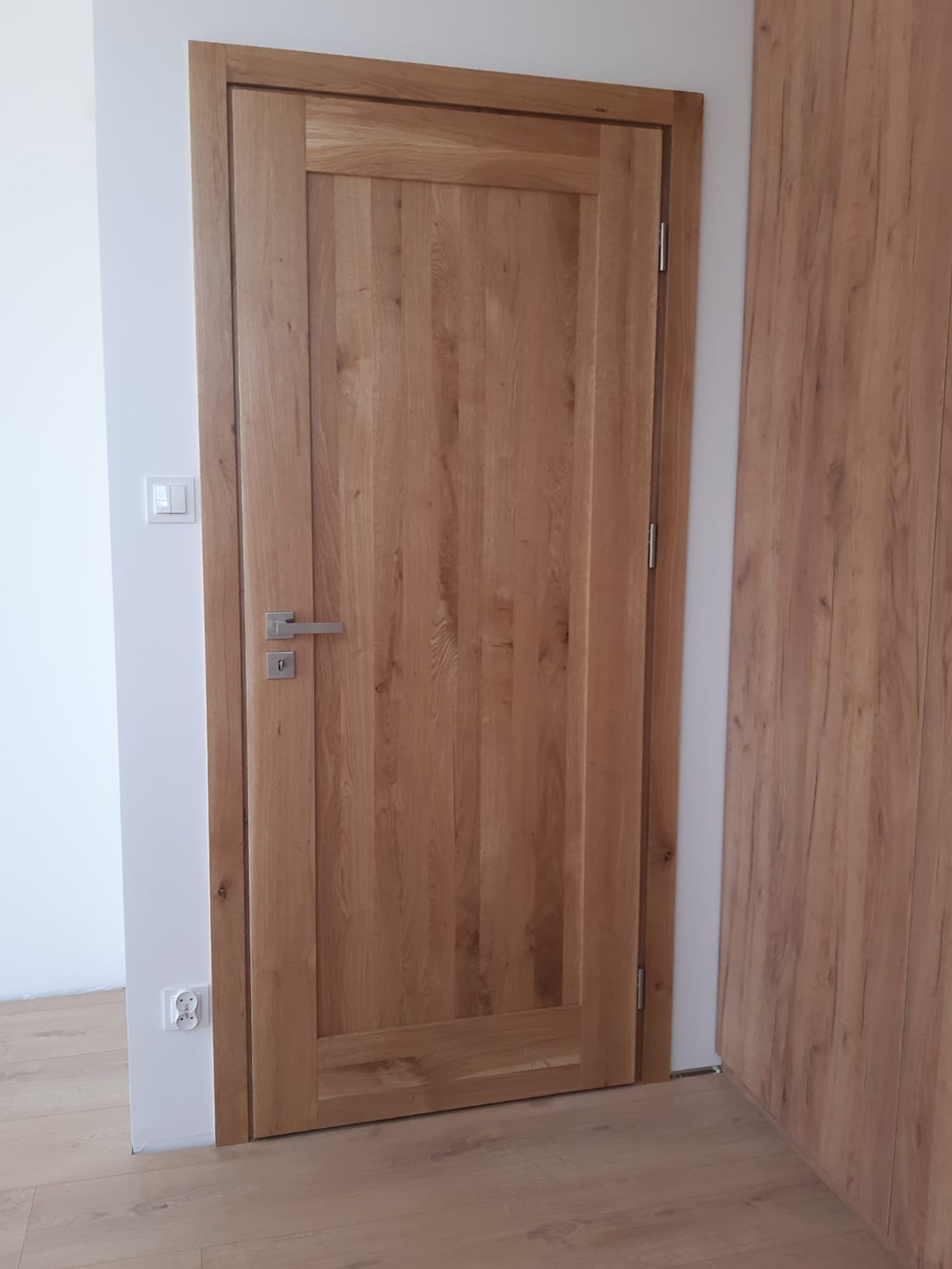 Drzwi drewniane wewnętrzne wykonujemy z drewna klejonego: sosnowego, jesionowego lub dębowego. Wzór dowolny, według wizji klienta. Do produkcji drzwi z szybą używamy szkła mlecznego, hartowanego, fazowanego, piaskowanego.