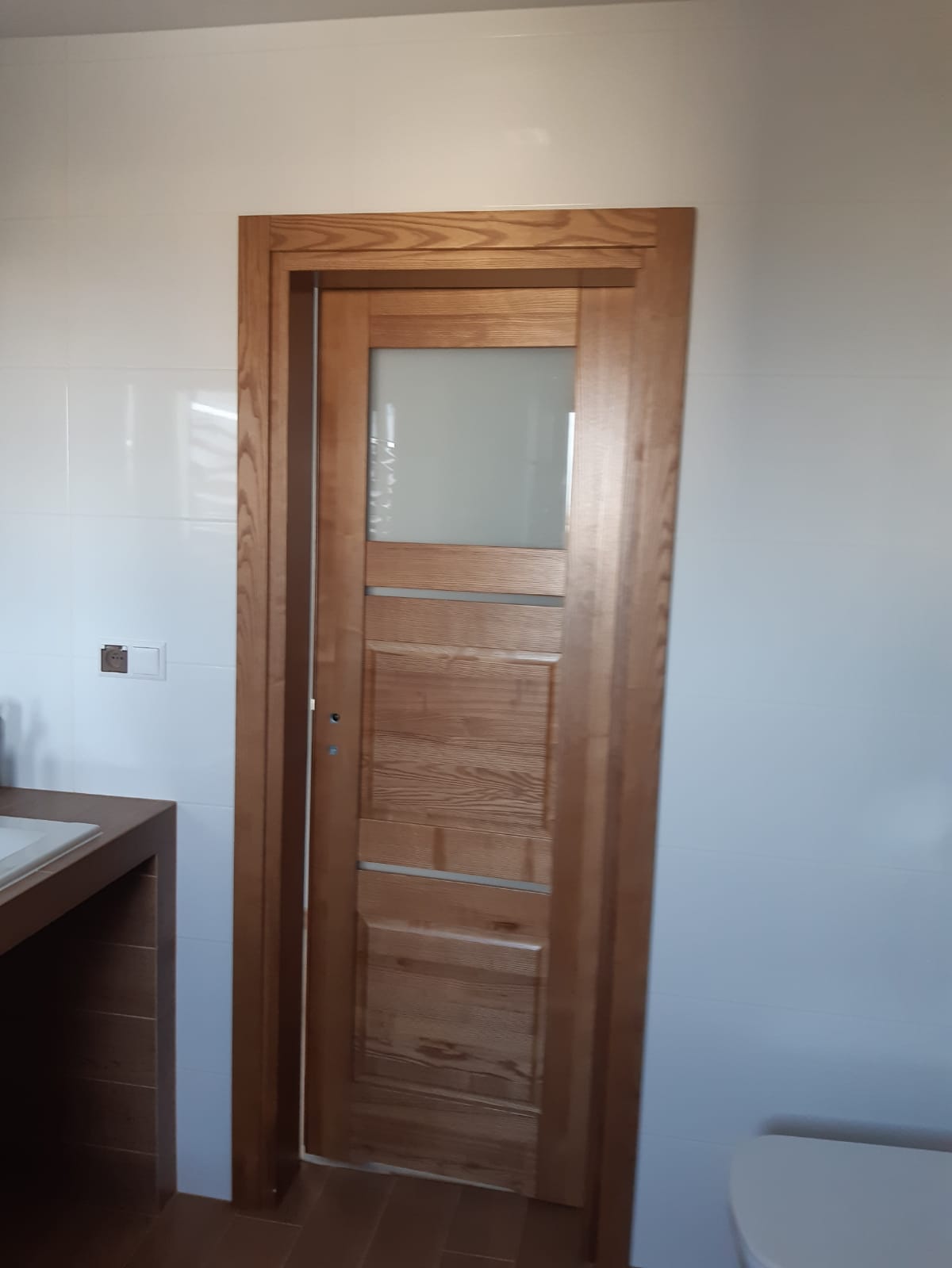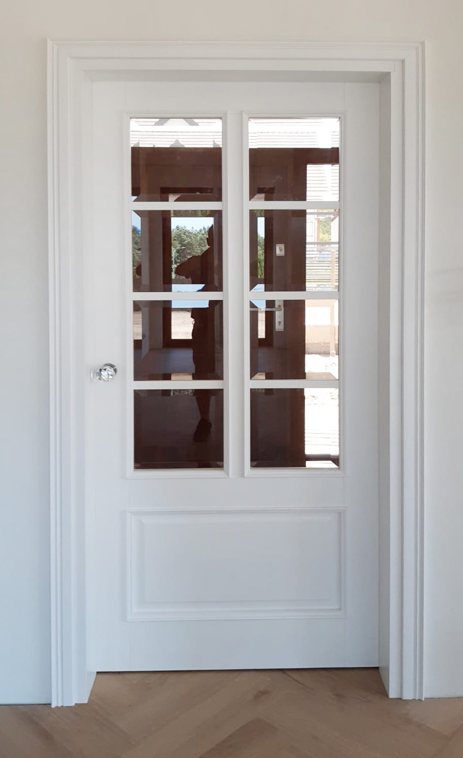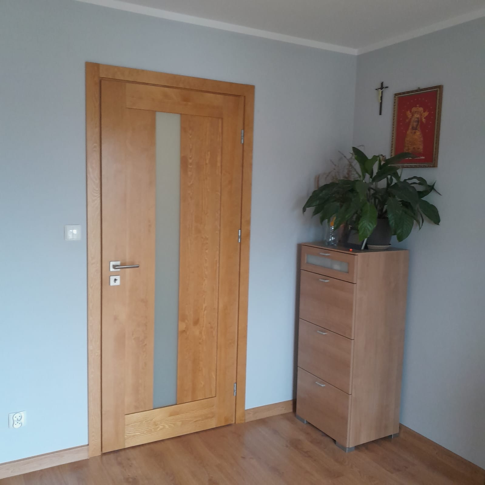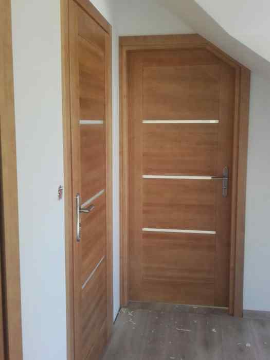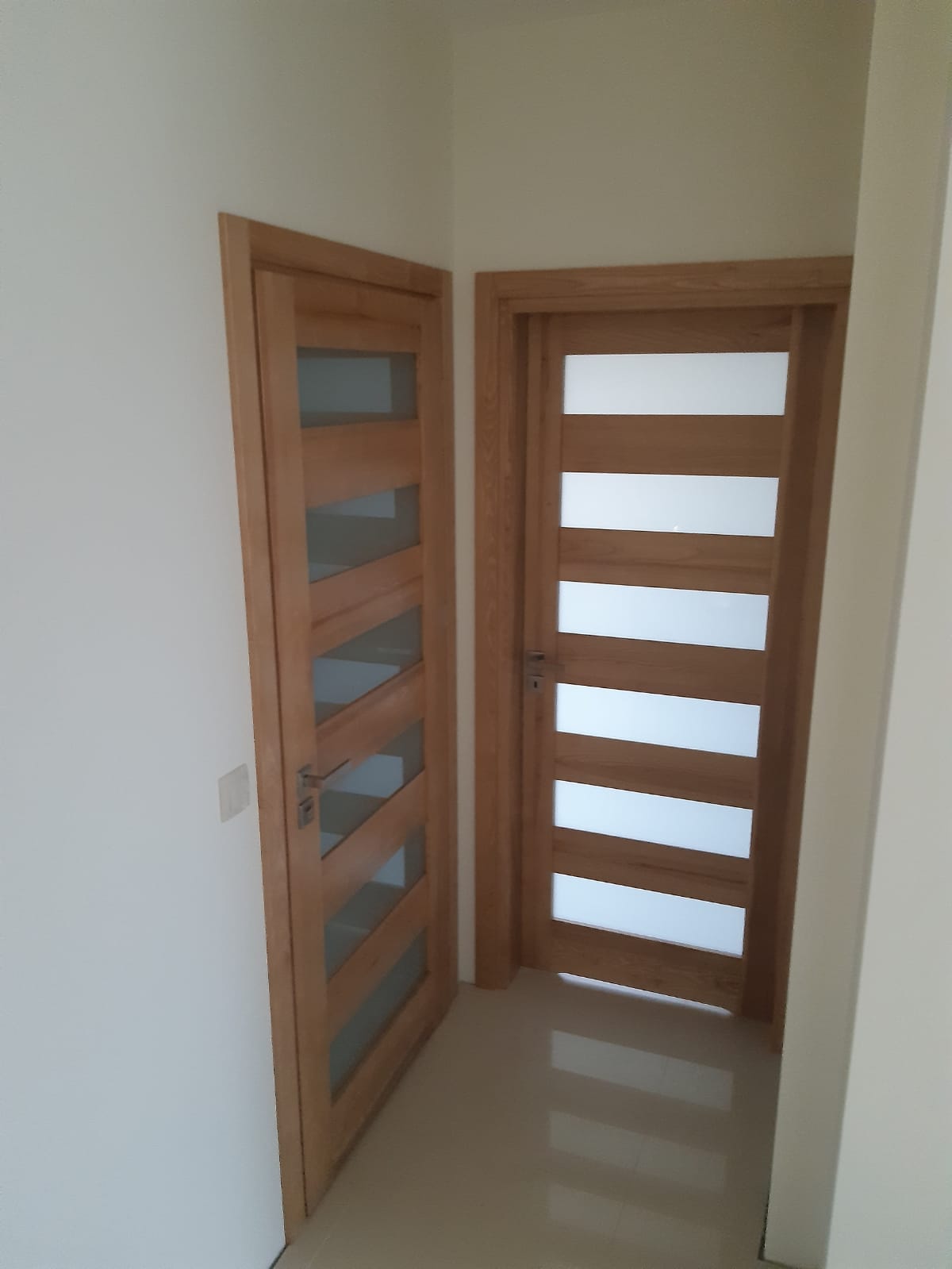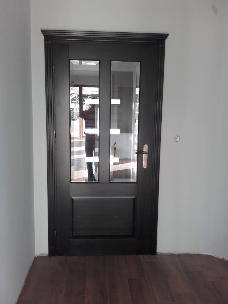 Drzwi drewniane wewnętrzne wykonujemy z drewna klejonego: sosnowego, jesionowego lub dębowego. Wzór dowolny, według wizji klienta. Do produkcji drzwi z szybą używamy szkła mlecznego, hartowanego, fazowanego, piaskowanego.