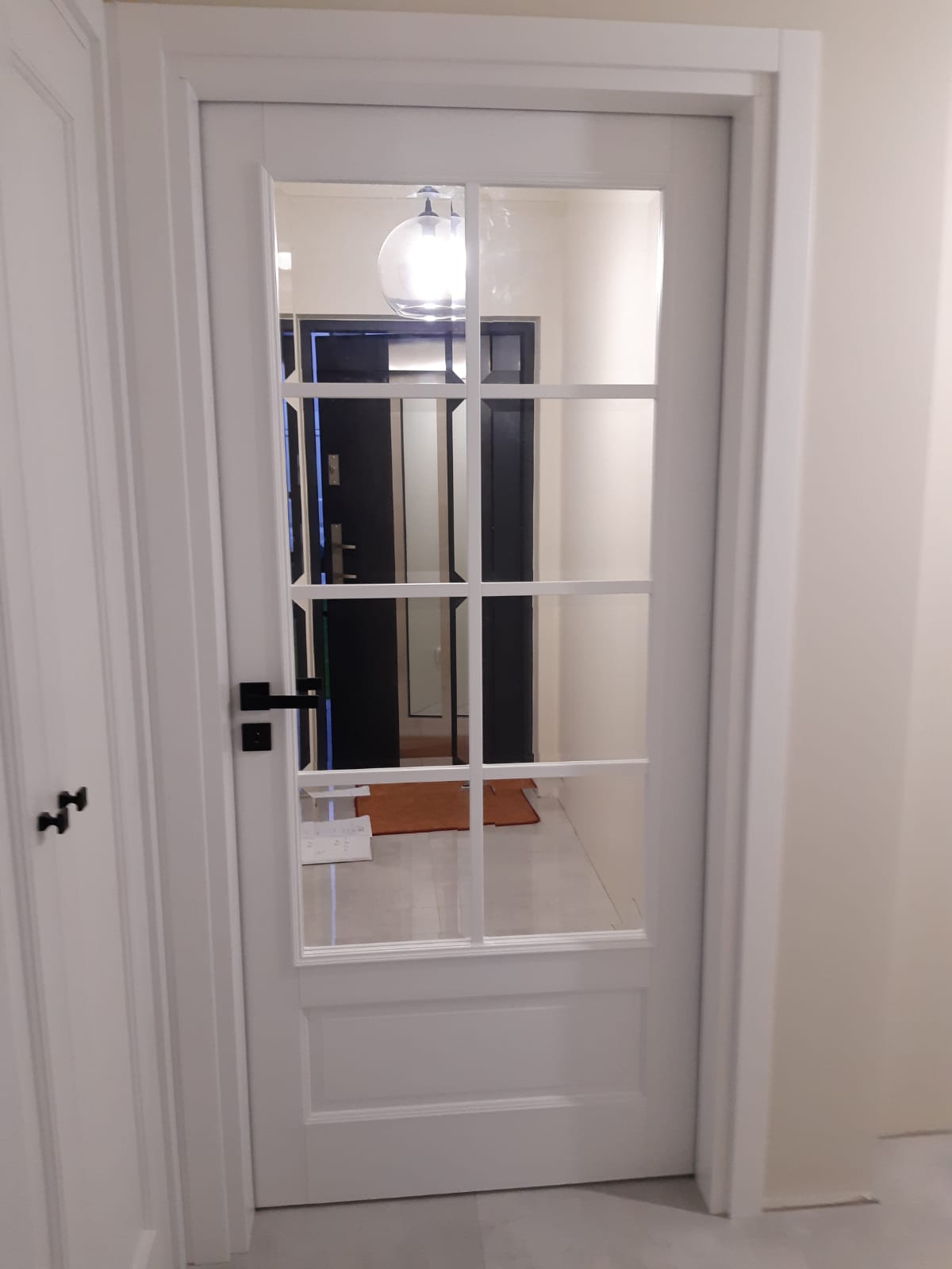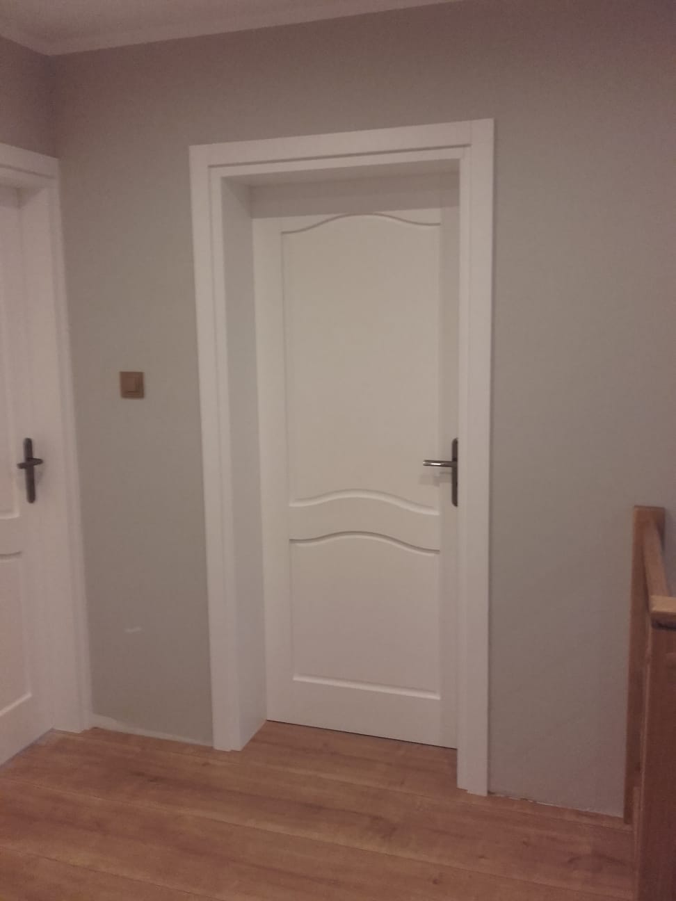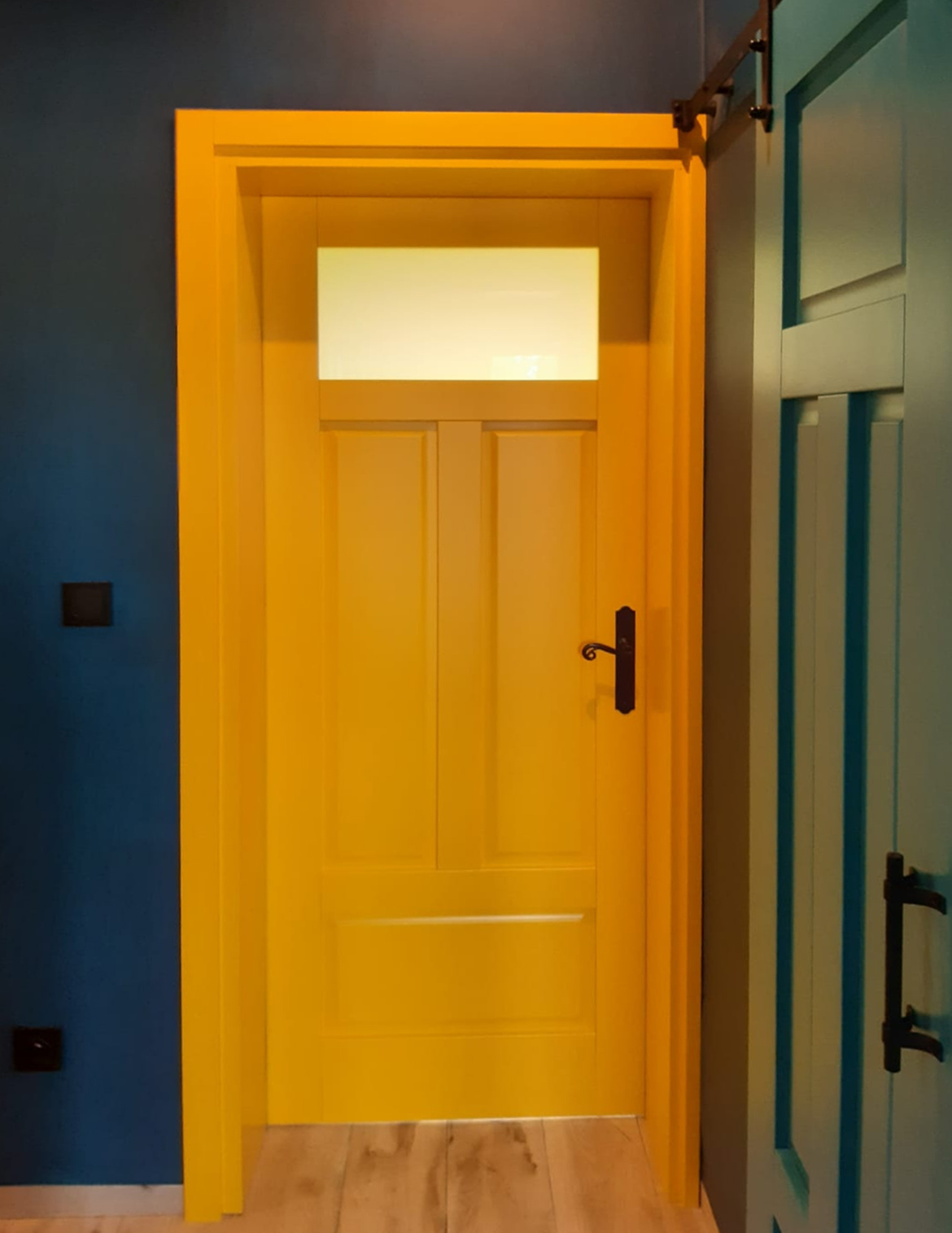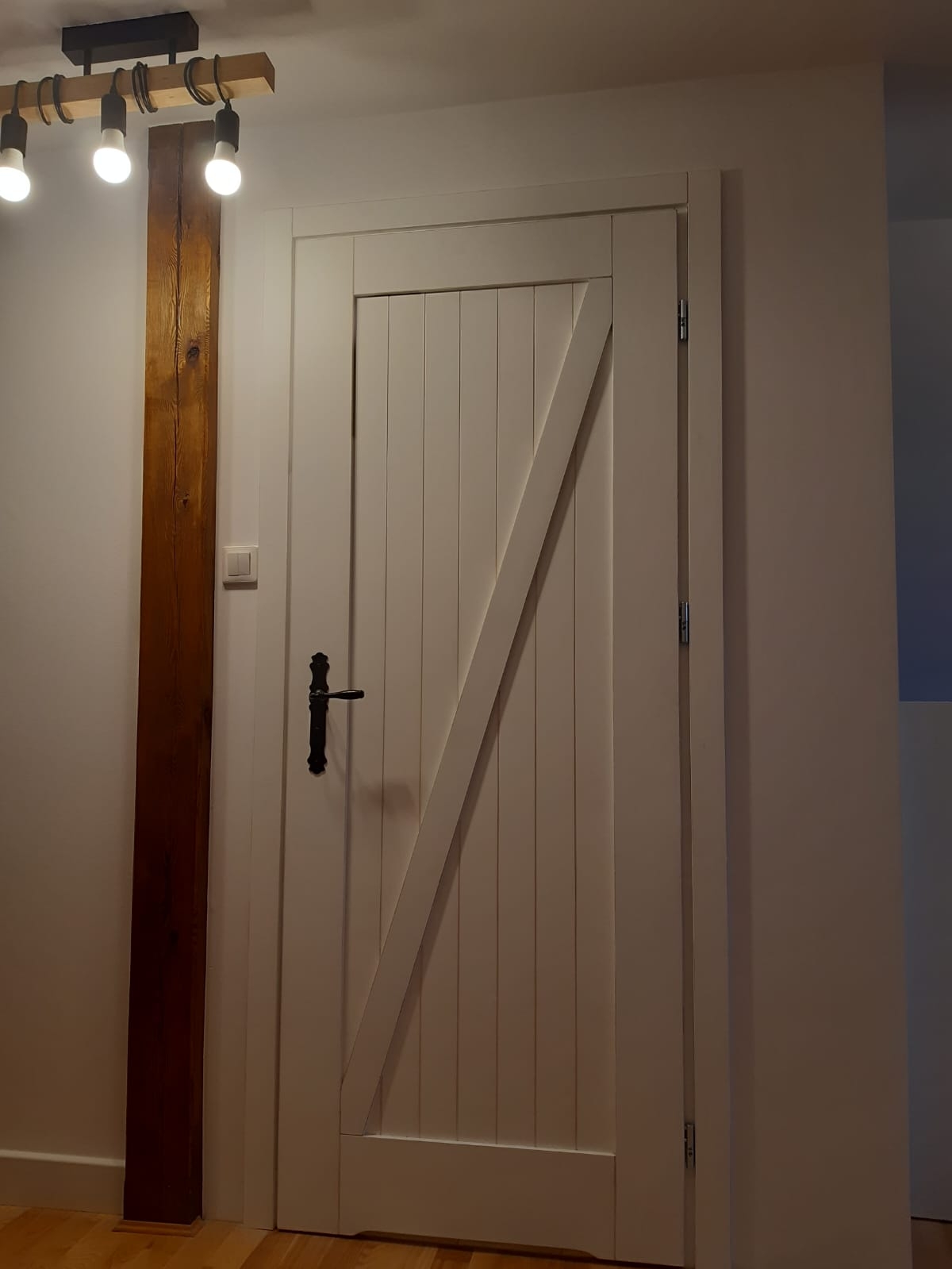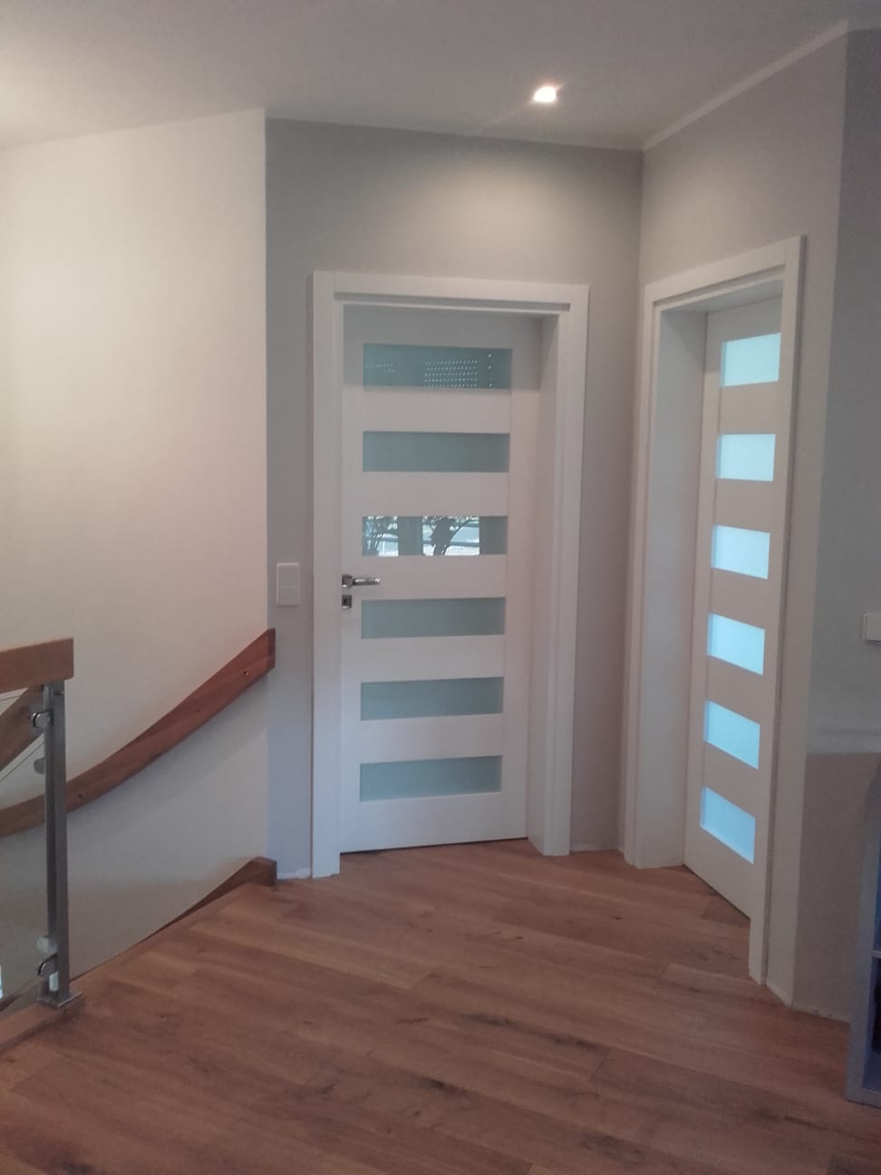 Drzwi drewniane wewnętrzne wykonujemy z drewna klejonego: sosnowego, jesionowego lub dębowego. Wzór dowolny, według wizji klienta. Do produkcji drzwi z szybą używamy szkła mlecznego, hartowanego, fazowanego, piaskowanego.