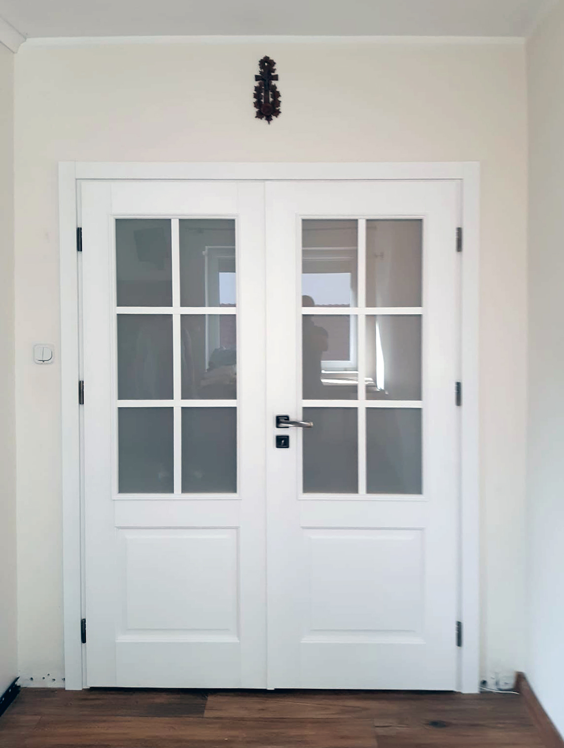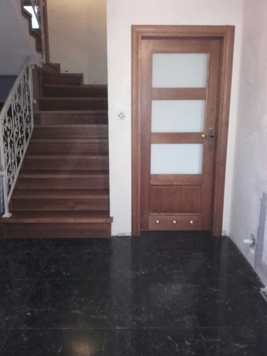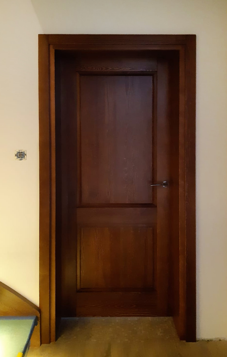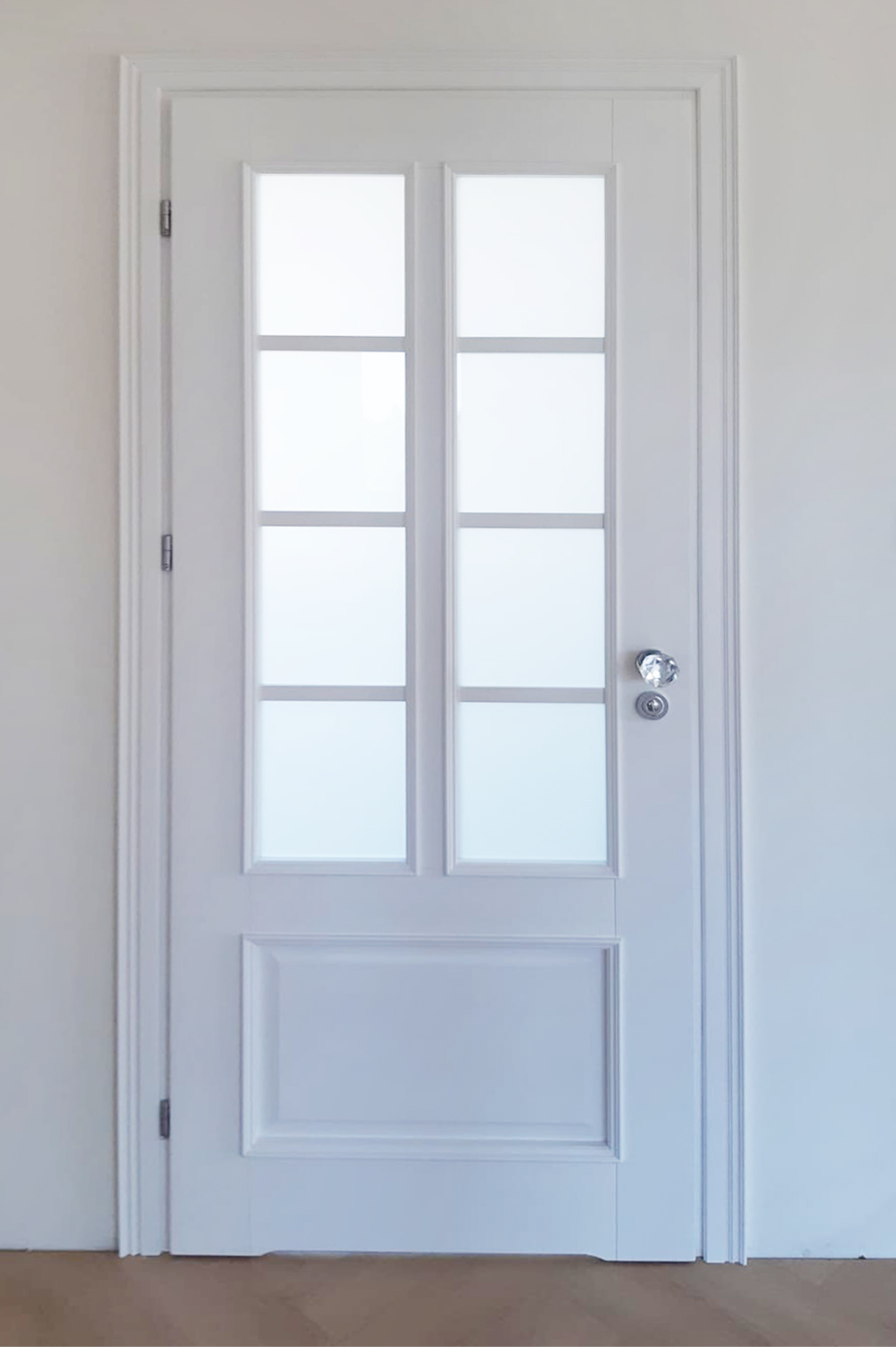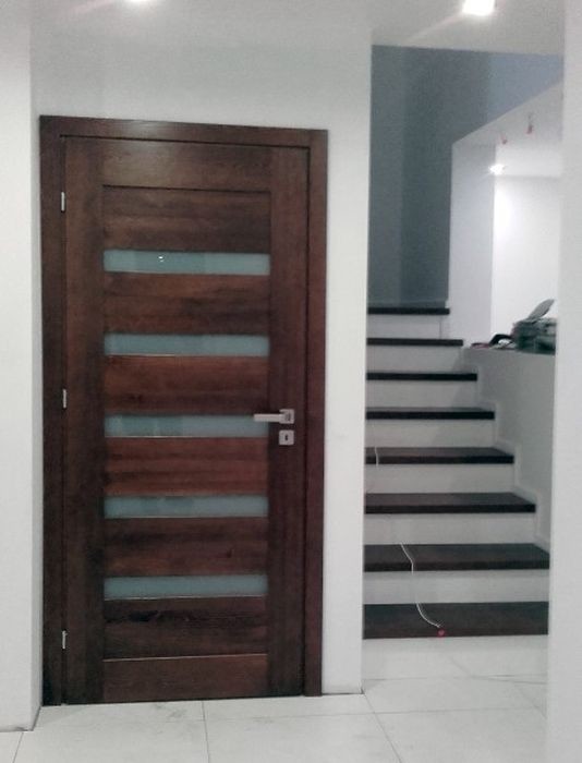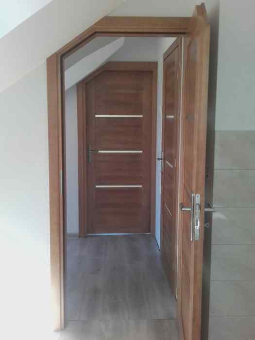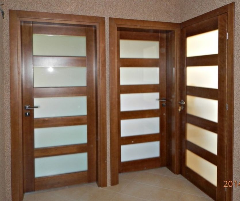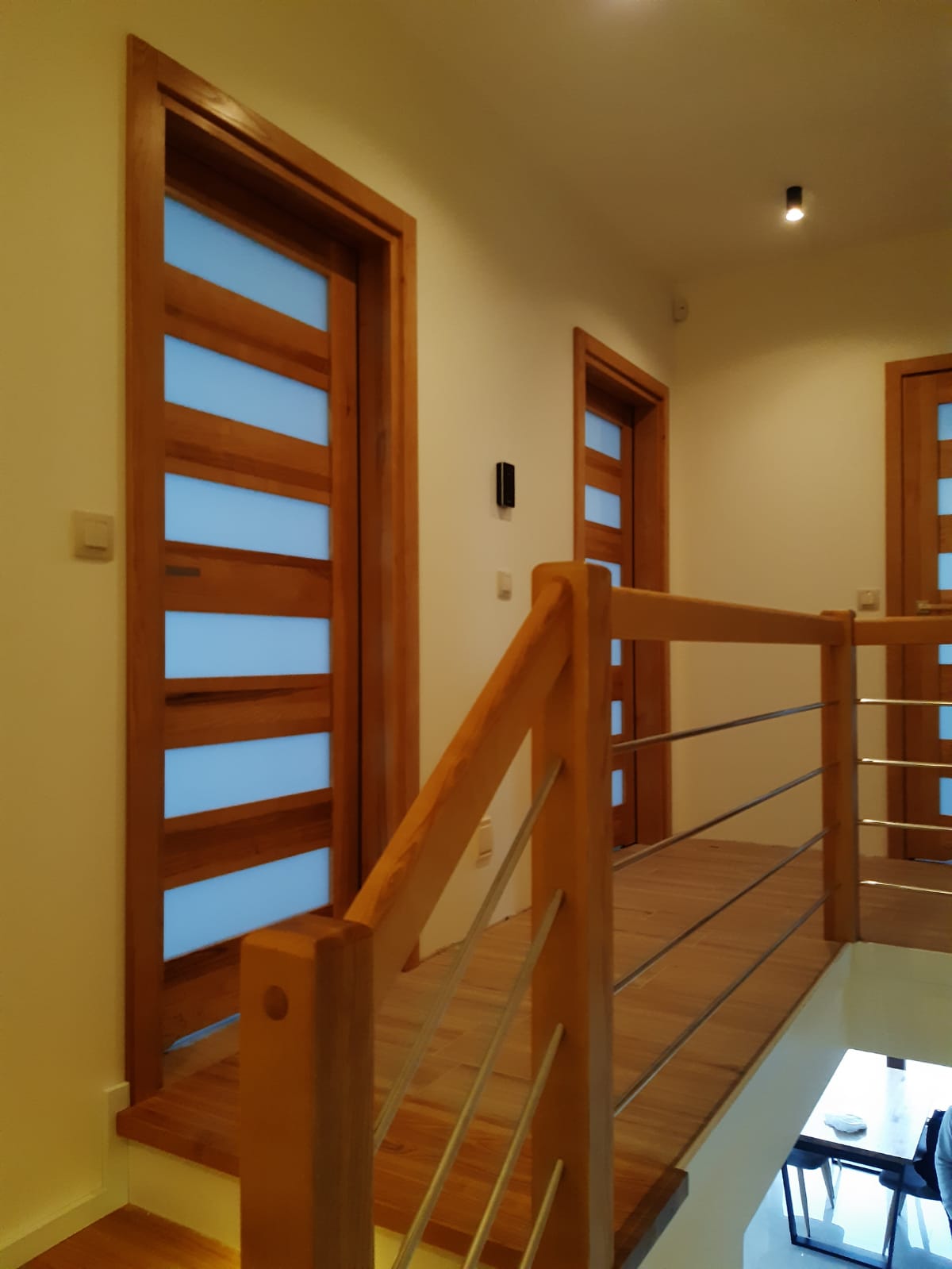 Drzwi drewniane wewnętrzne wykonujemy z drewna klejonego: sosnowego, jesionowego lub dębowego. Wzór dowolny, według wizji klienta. Do produkcji drzwi z szybą używamy szkła mlecznego, hartowanego, fazowanego, piaskowanego.