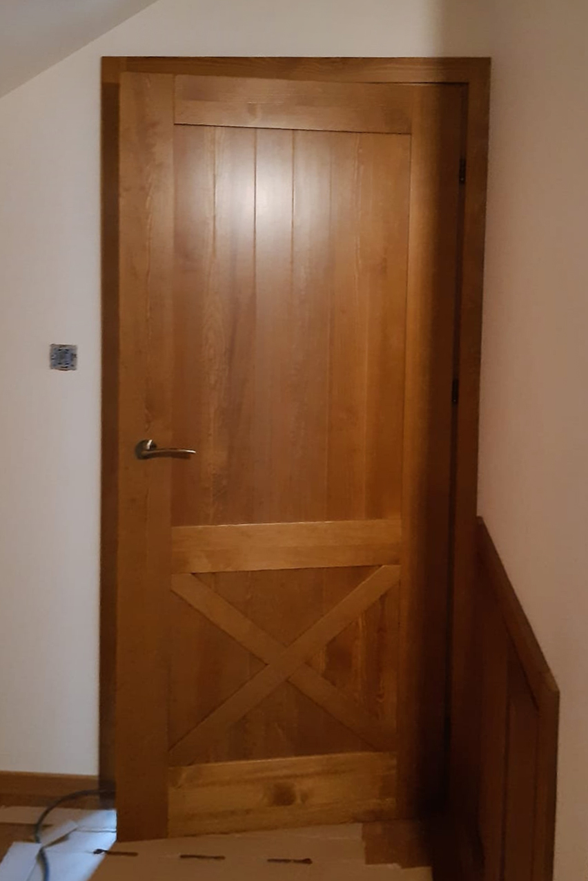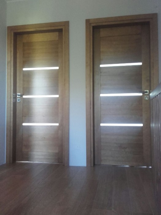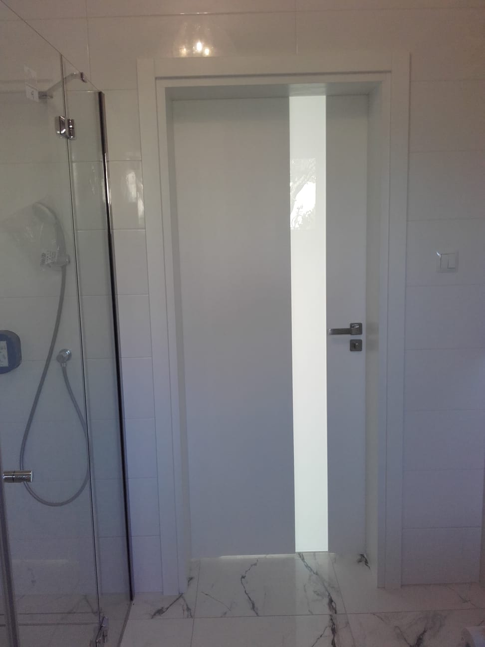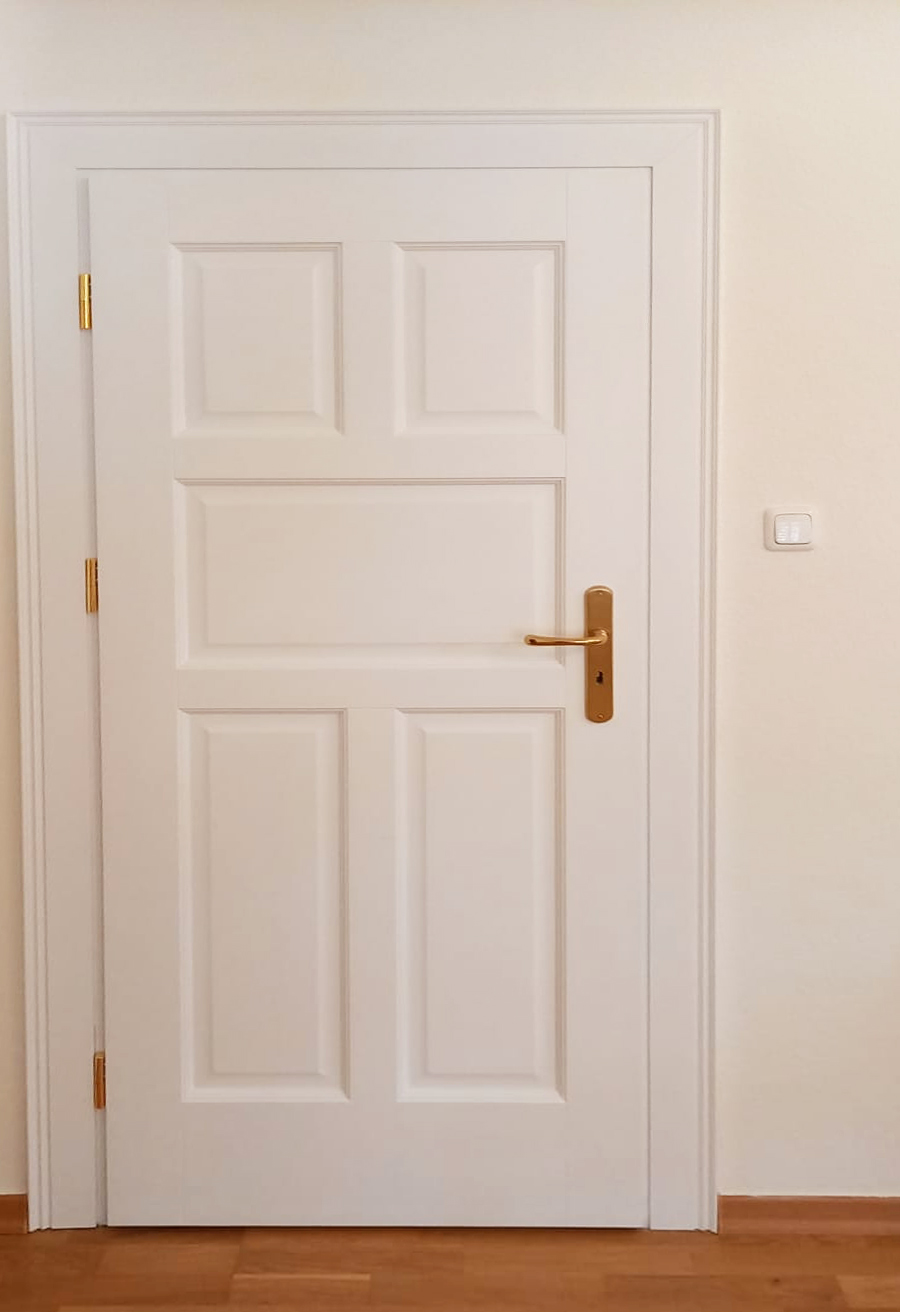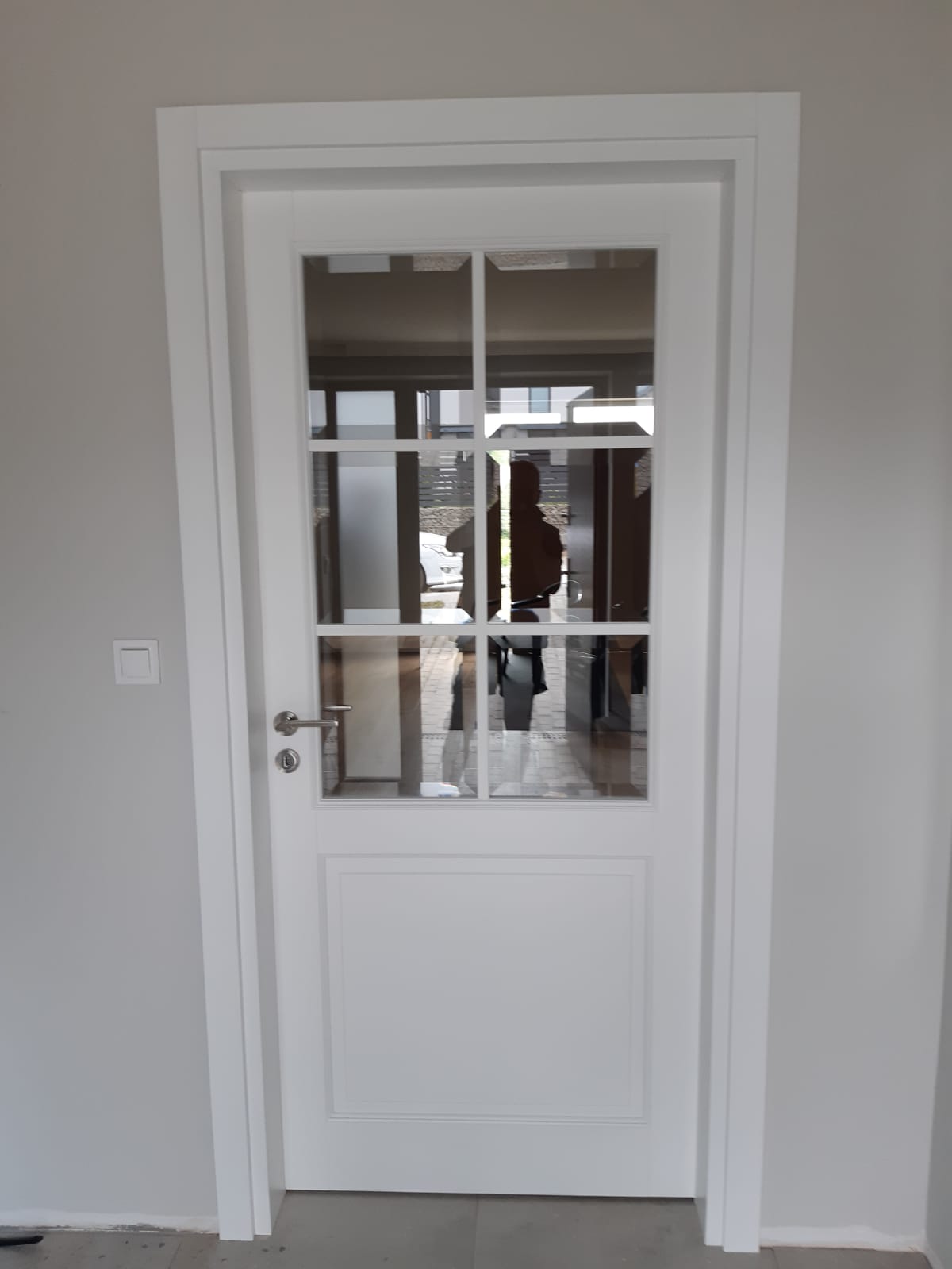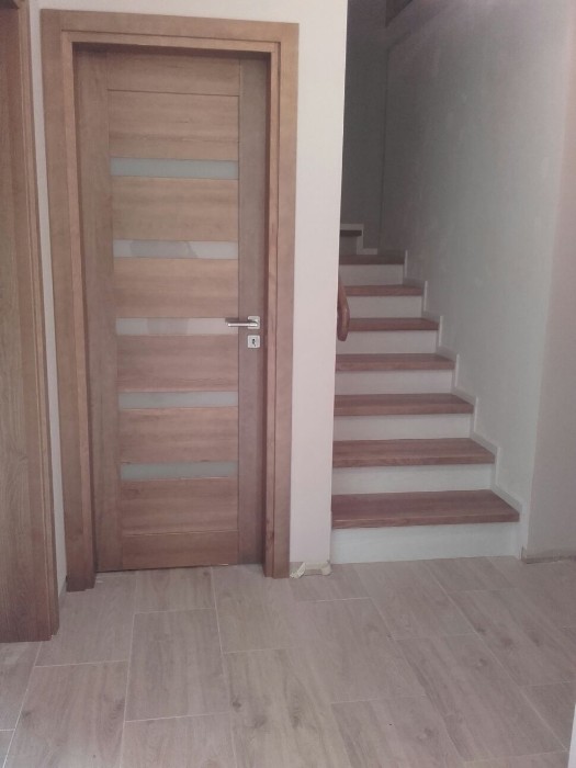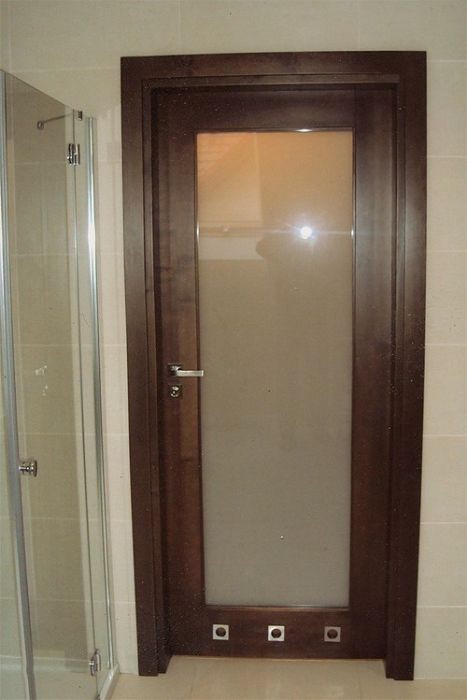 Drzwi drewniane wewnętrzne wykonujemy z drewna klejonego: sosnowego, jesionowego lub dębowego. Wzór dowolny, według wizji klienta. Do produkcji drzwi z szybą używamy szkła mlecznego, hartowanego, fazowanego, piaskowanego.