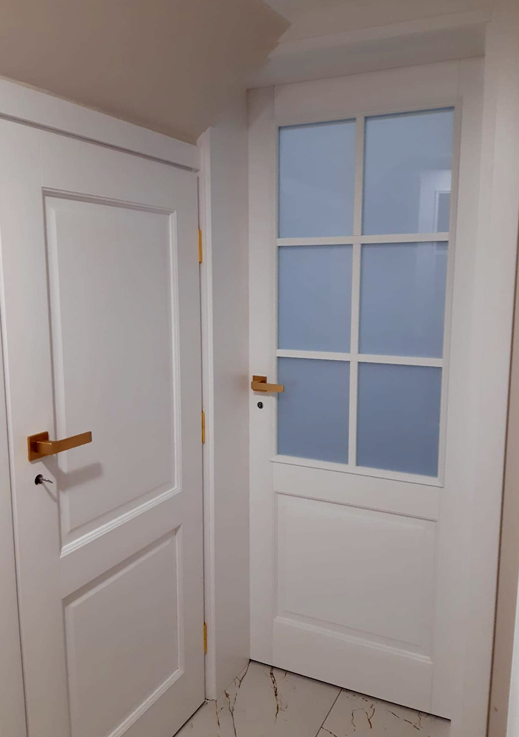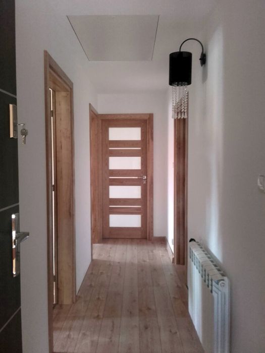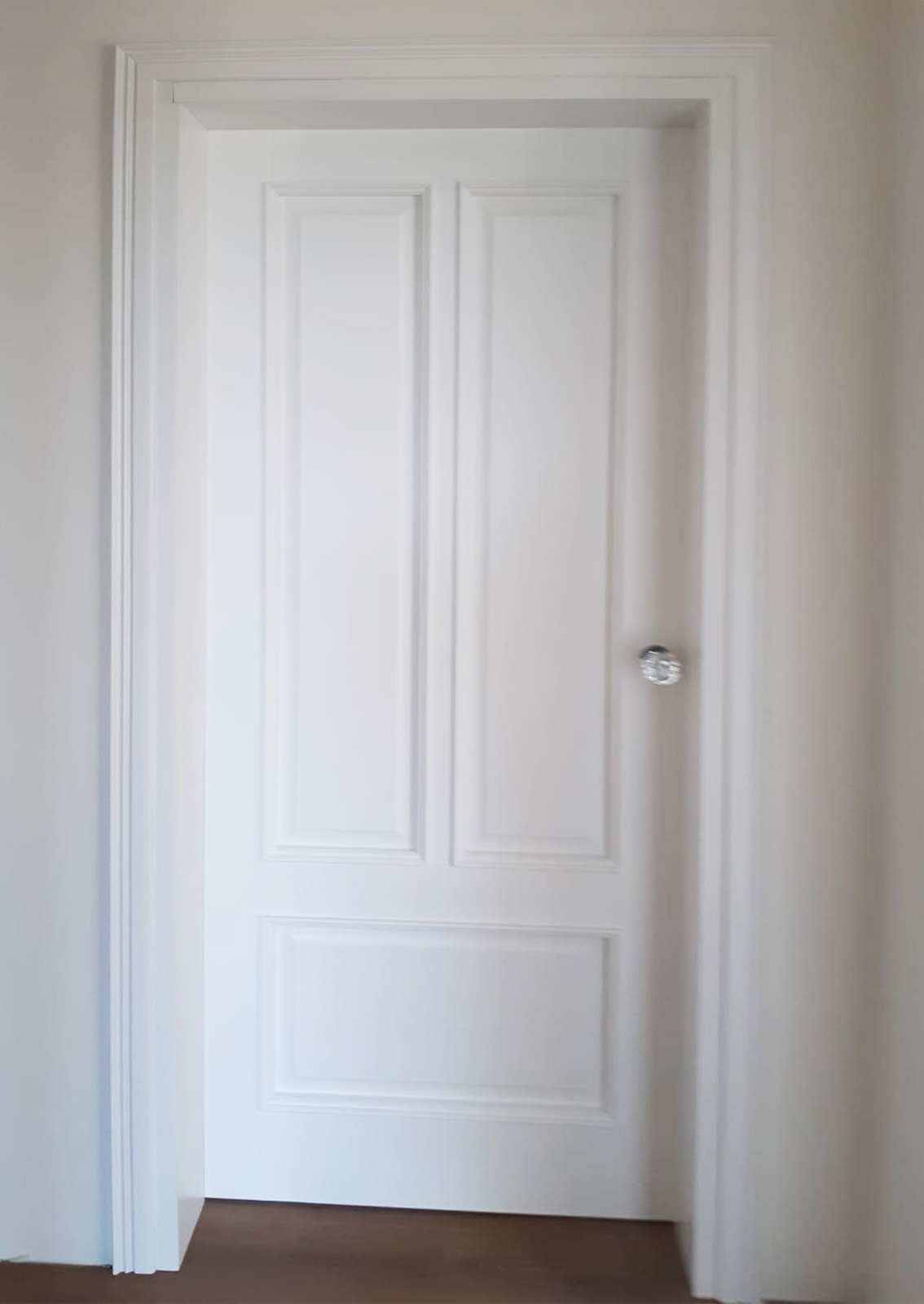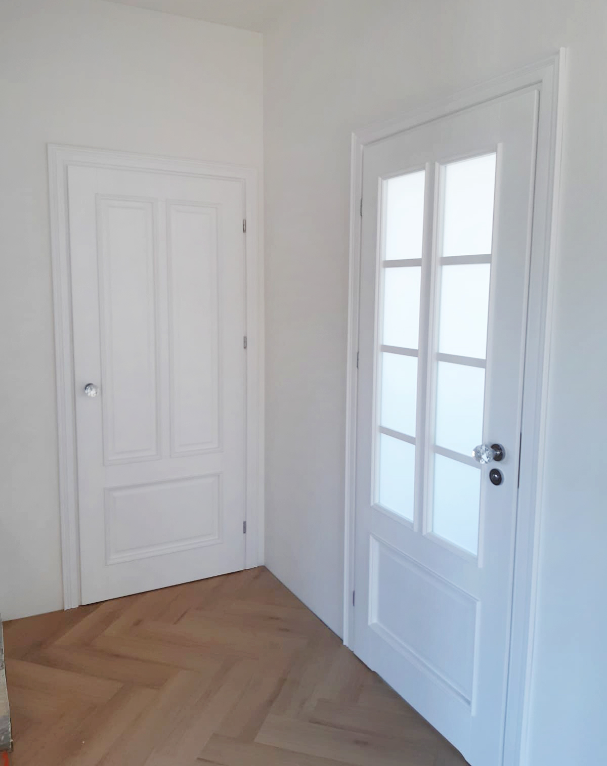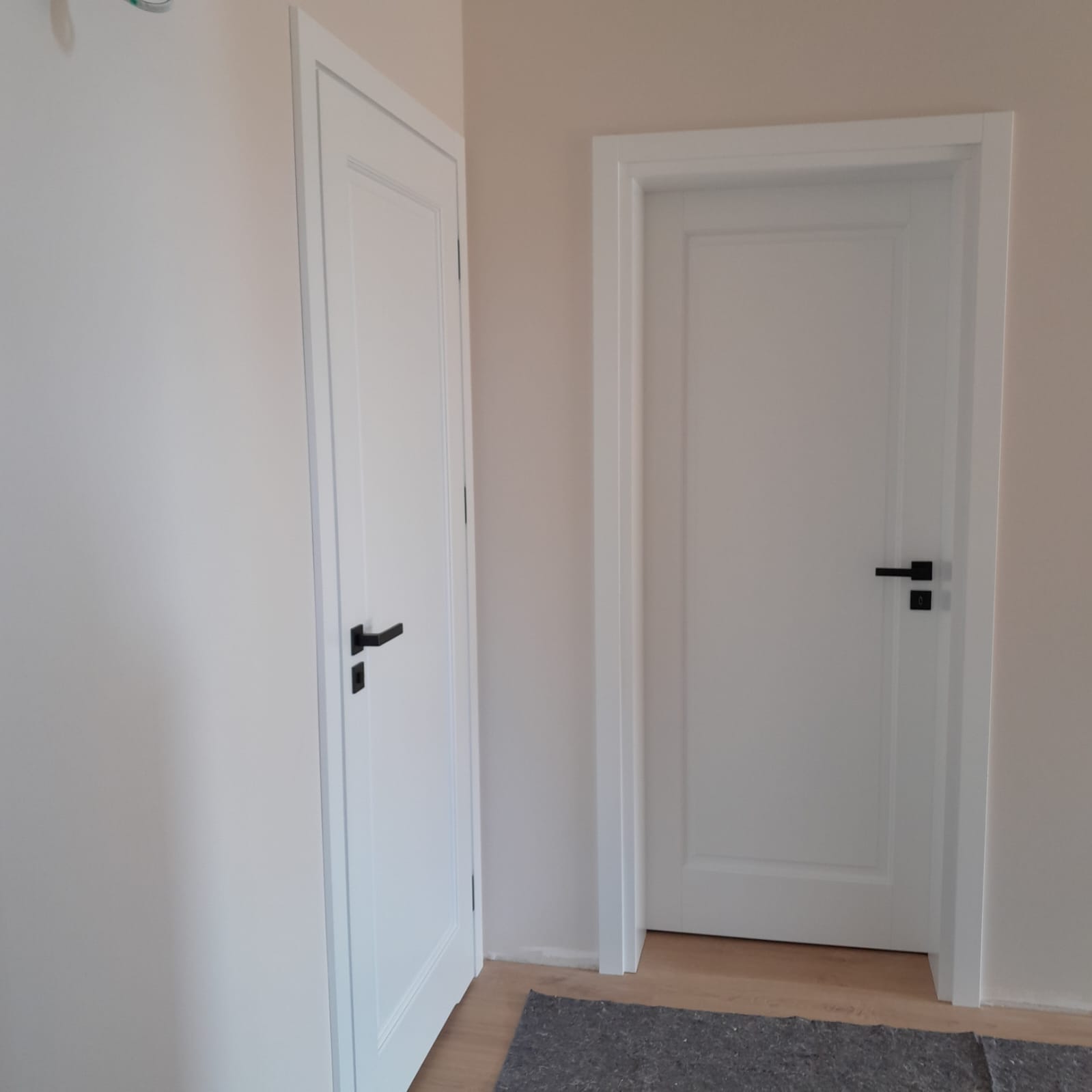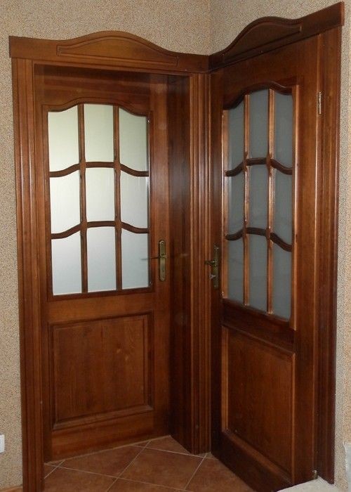 Drzwi drewniane wewnętrzne wykonujemy z drewna klejonego: sosnowego, jesionowego lub dębowego. Wzór dowolny, według wizji klienta. Do produkcji drzwi z szybą używamy szkła mlecznego, hartowanego, fazowanego, piaskowanego.