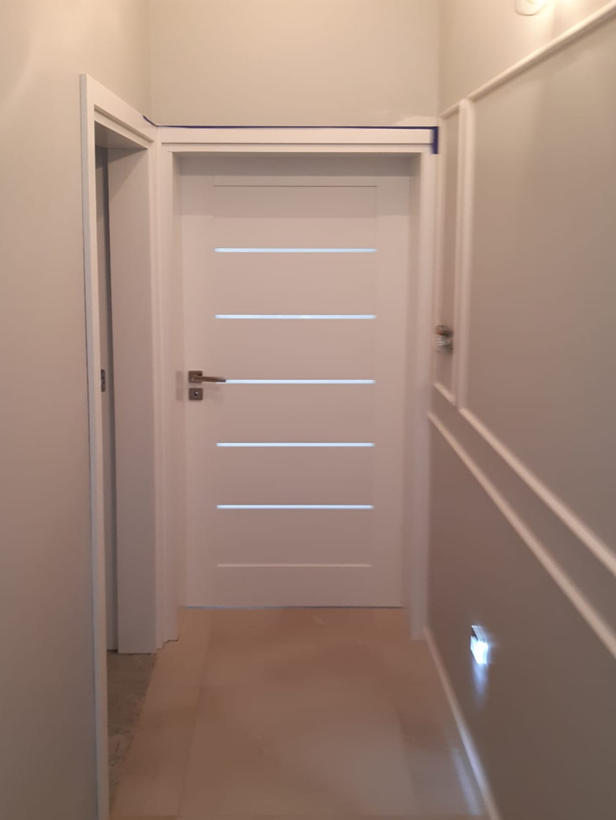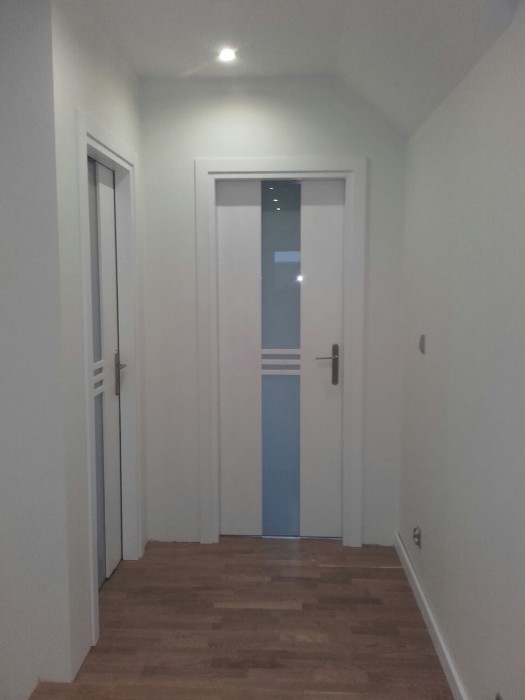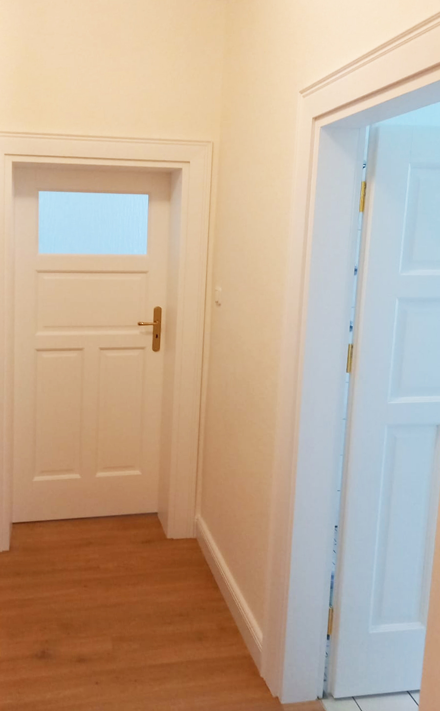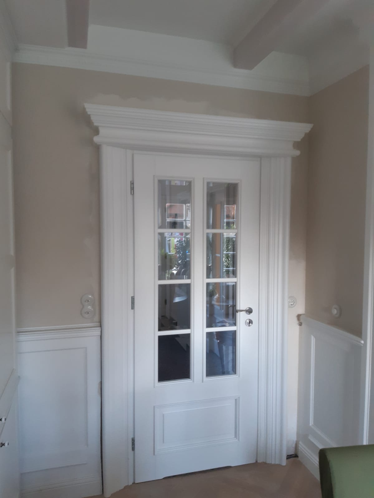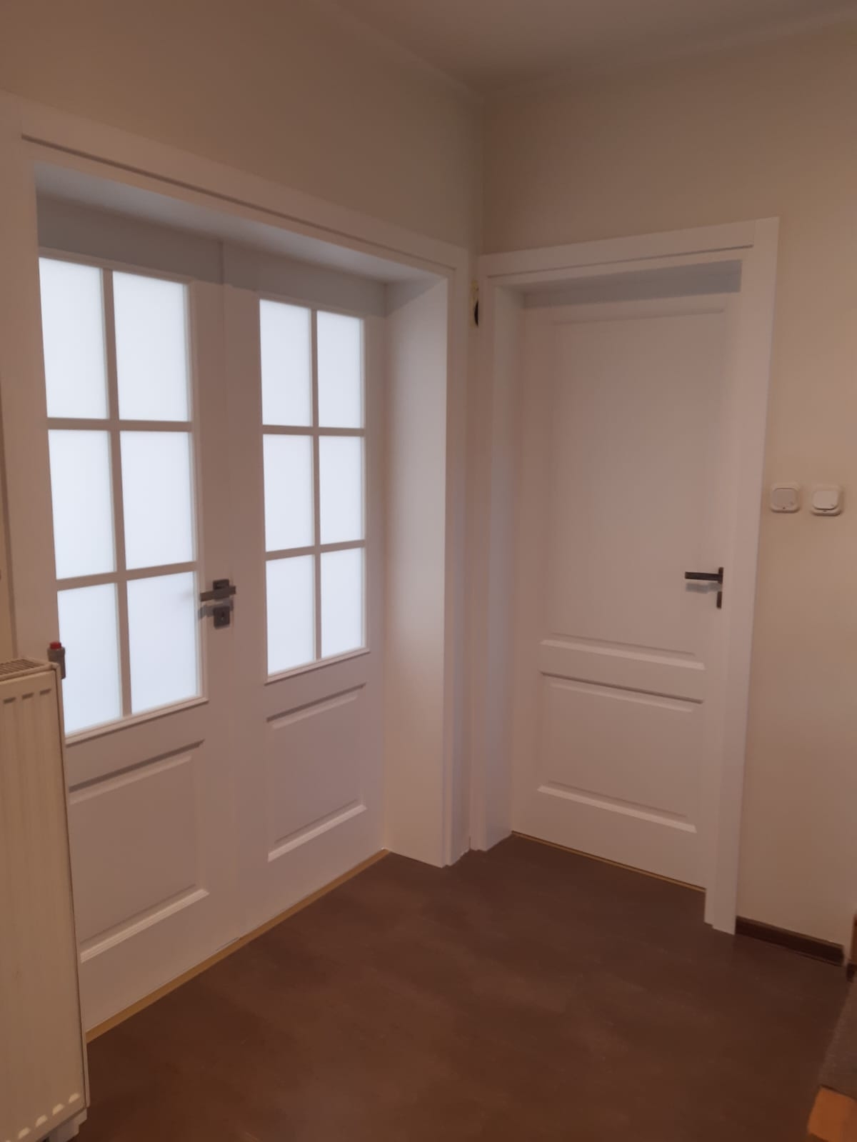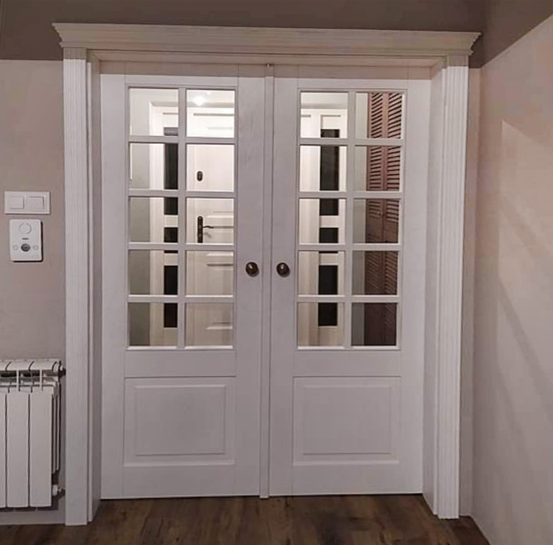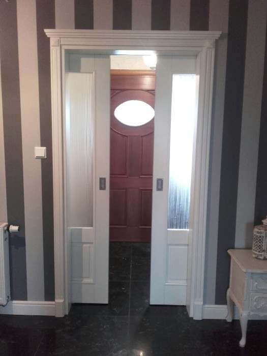 Drzwi drewniane wewnętrzne wykonujemy z drewna klejonego: sosnowego, jesionowego lub dębowego. Wzór dowolny, według wizji klienta. Do produkcji drzwi z szybą używamy szkła mlecznego, hartowanego, fazowanego, piaskowanego.